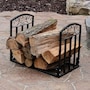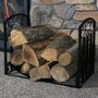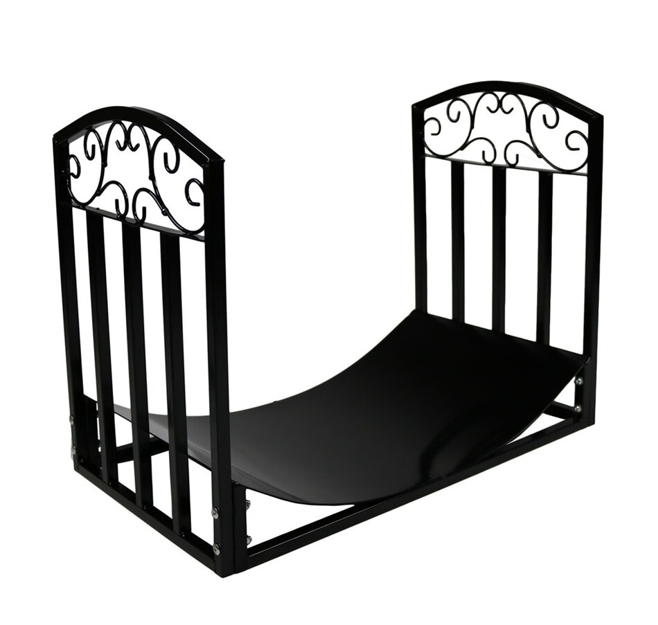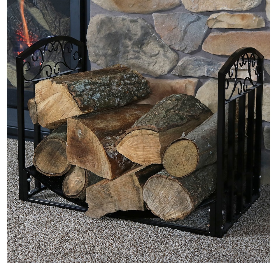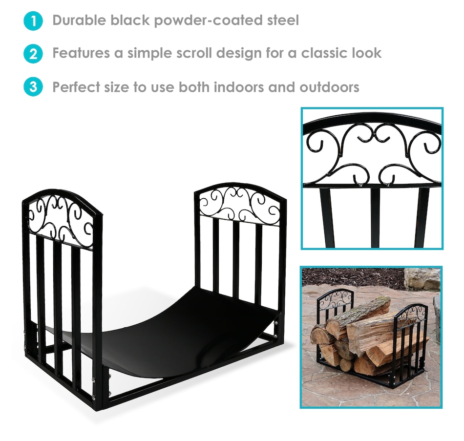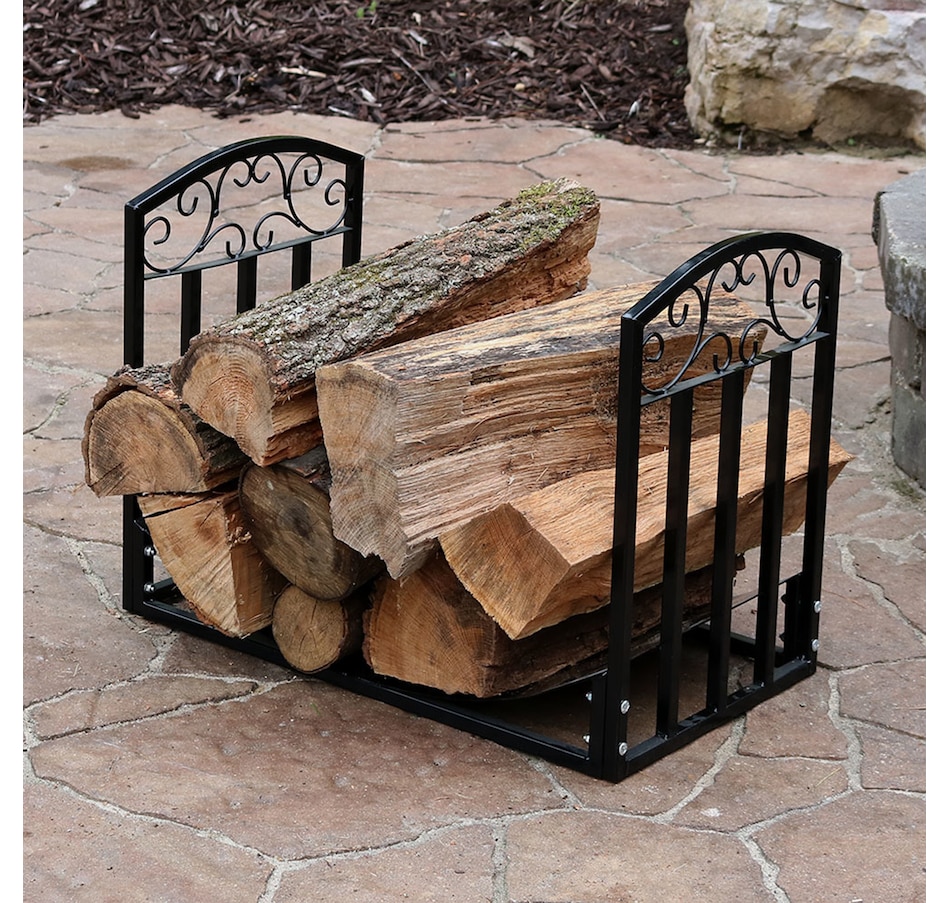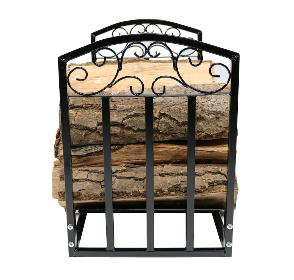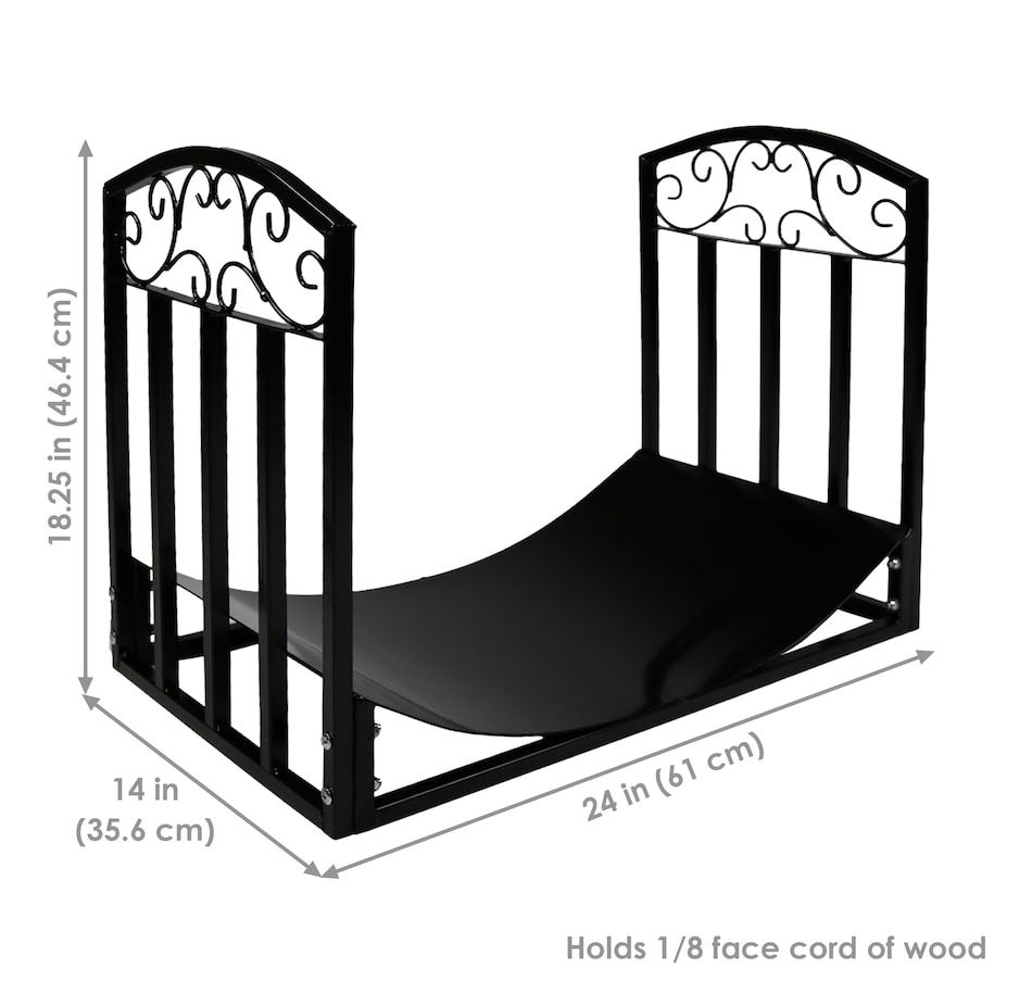 Small decorative log holders like this one are great places to store firewood whether it is placed on the patio, in the garden, or indoors near the fireplace. Featuring a scroll-like design on the sides and striped metal details throughout, this firewood holder is the modern, classic design sure to complement any contemporary space. This designer firewood log rack is a smaller size to fit wonderfully nearby any fire pit or fireplace indoors, or even place this outside on the deck, patio, or in the yard next to any fire feature to keep the warmth lasting all night long. This log rack is sure to fit anywhere in the yard or home and uplift any styled area naturally. This firewood log rack measures 24" W x 18.25" tall, and is able to hold up to 1/8 face cord of wood. Keep the fire burning and look good while doing it with this designer firewood log rack.