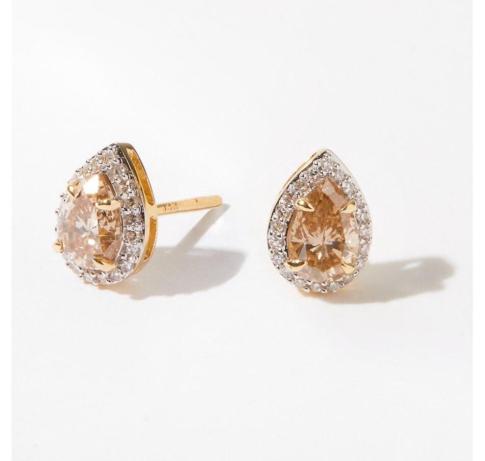 • (2) pear-shaped, prong-set and faceted champagne diamonds (0.90 av. ctw)