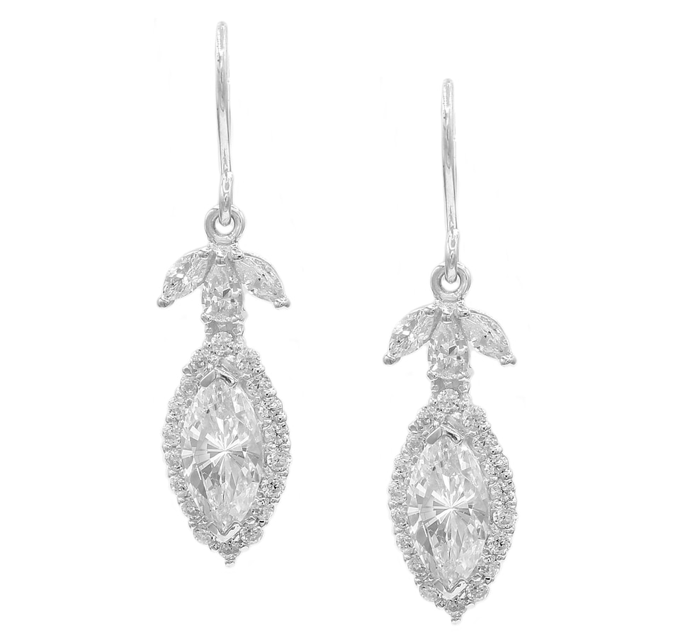 • (2) 10 x 5mm, (4) 4 x 2mm marquise shape, (2) 4 x 2.5mm pear shape, (36) 1.50mm round shape, prong set & faceted Diamonelle; Looks like 3.12 av.ctw of real diamonds