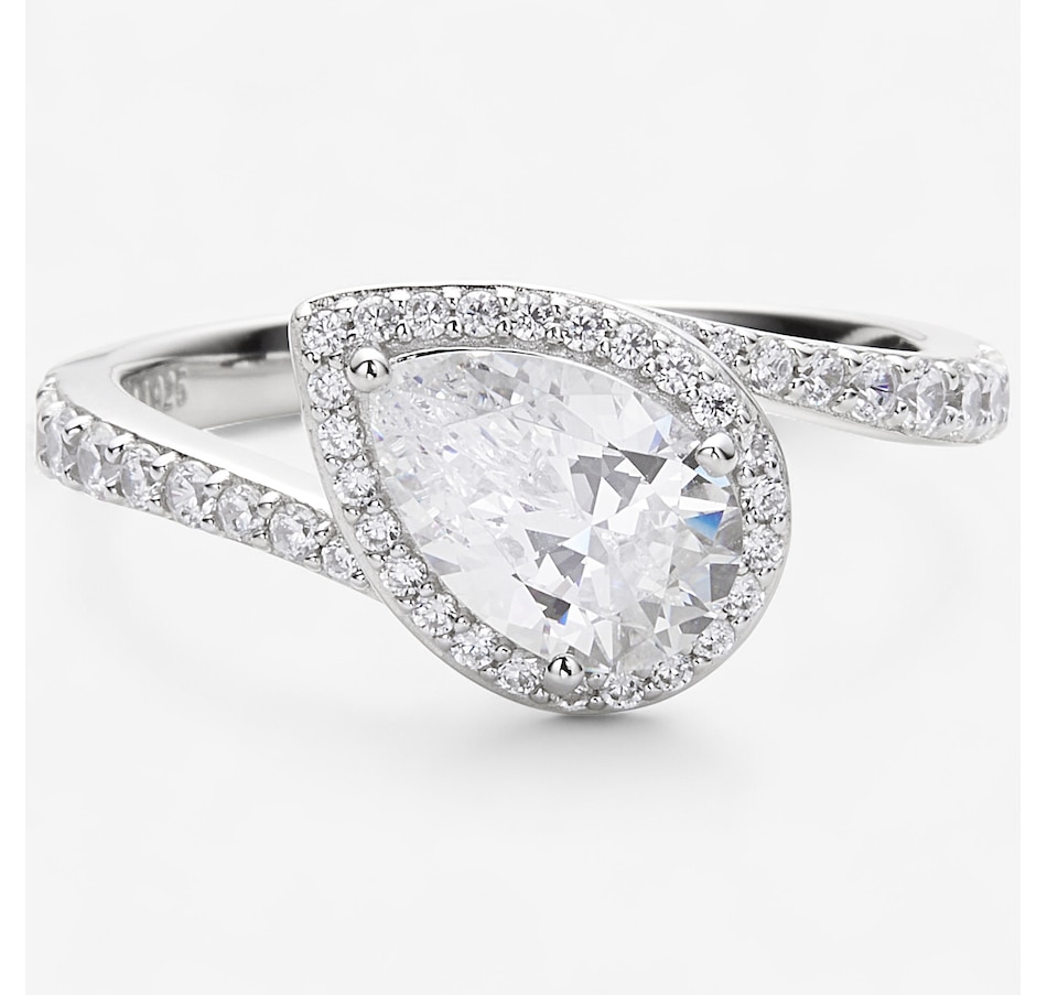 Sterling Silver Rhodium Plate Diamonelle Pear Shape Halo Ring