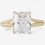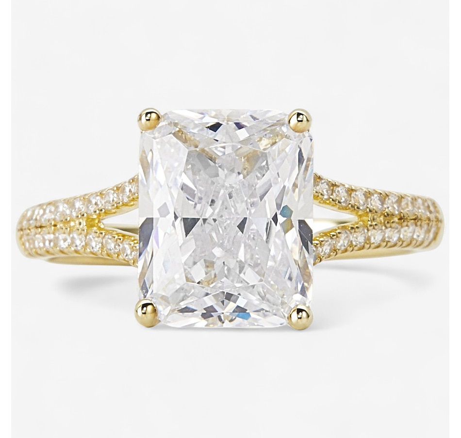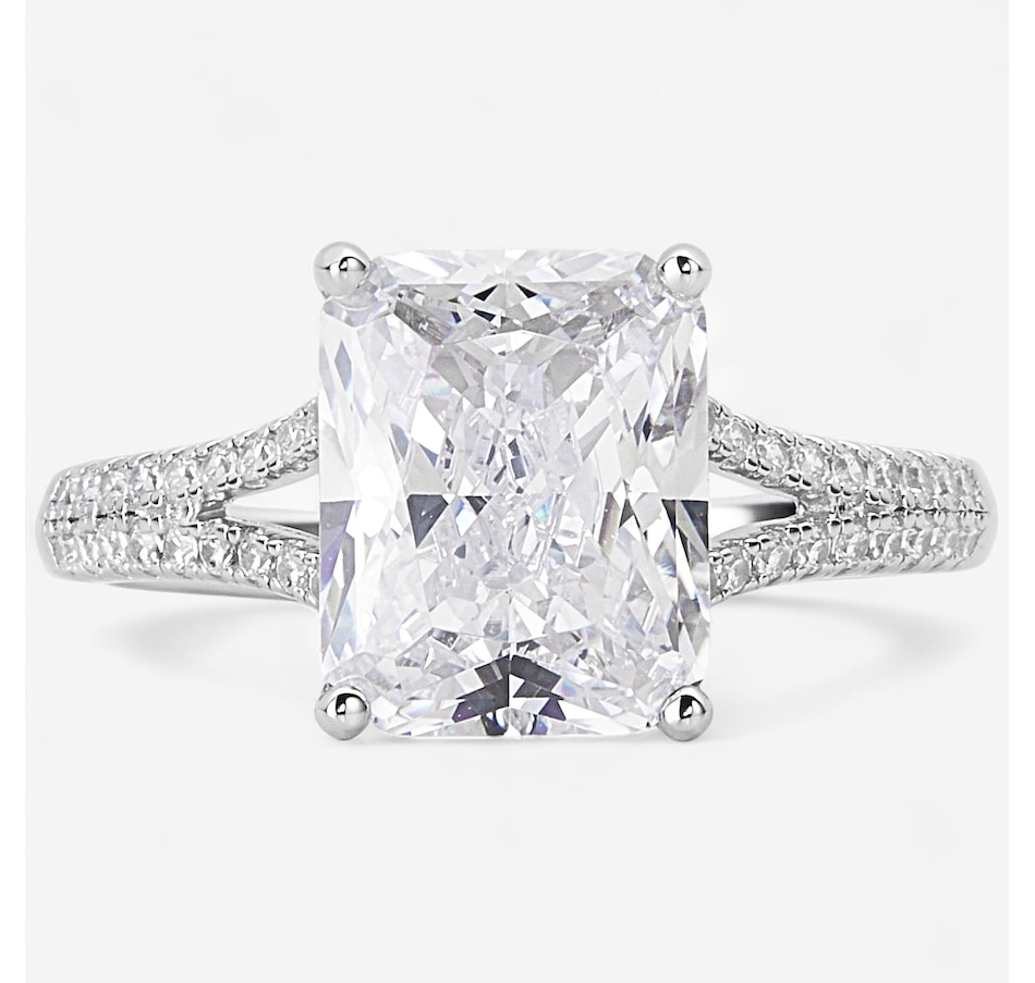 • (1) 10x8mm emerald cut, prong set & faceted Diamonelle