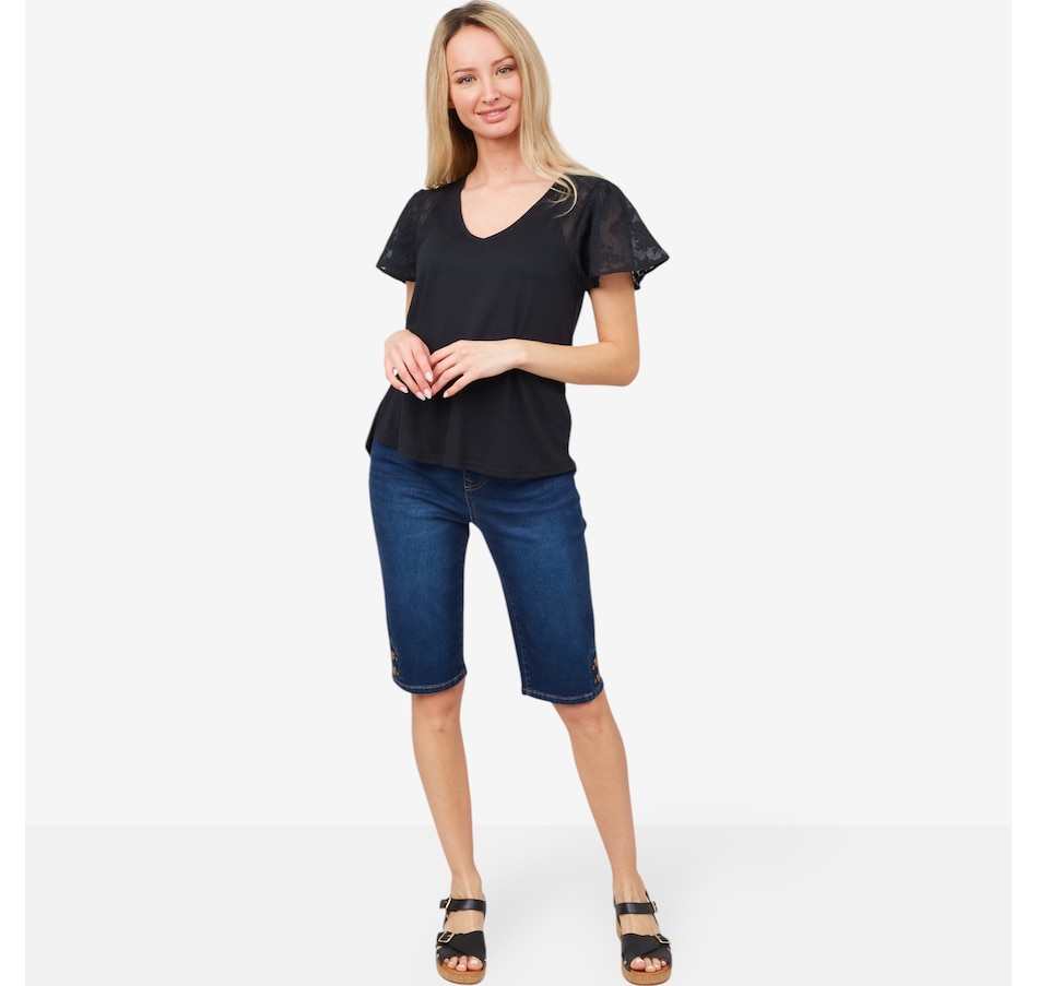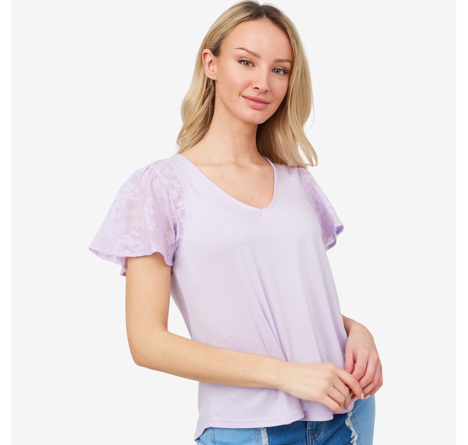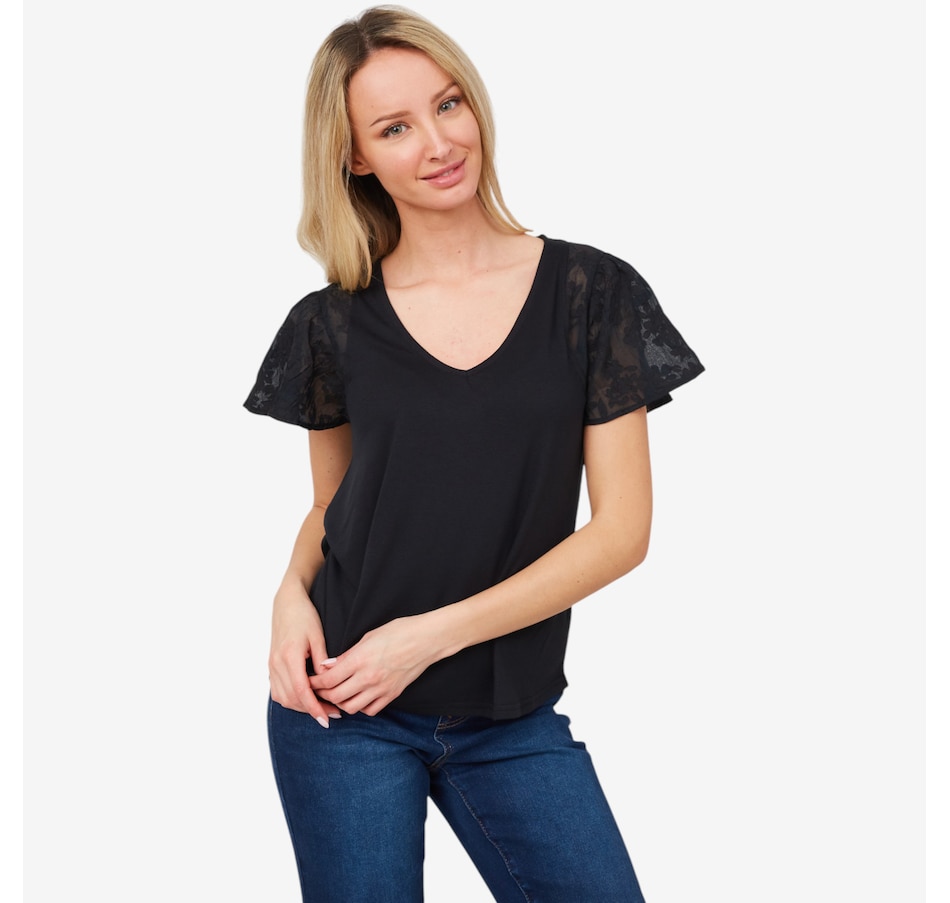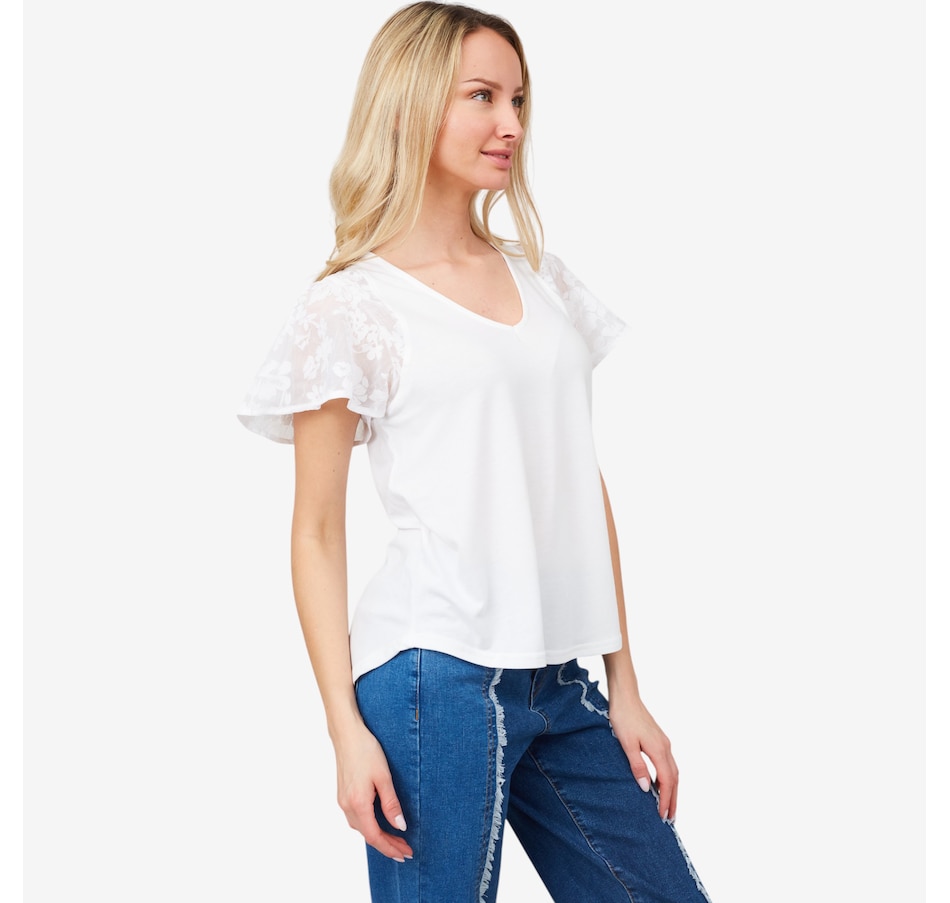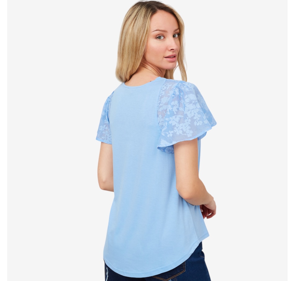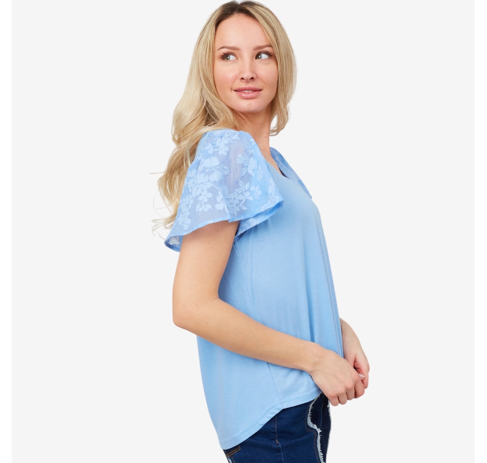 Centre your look in beautiful, easy style wearing this lovely floral flutter sleeve mix media knit top from Diane Gilman.