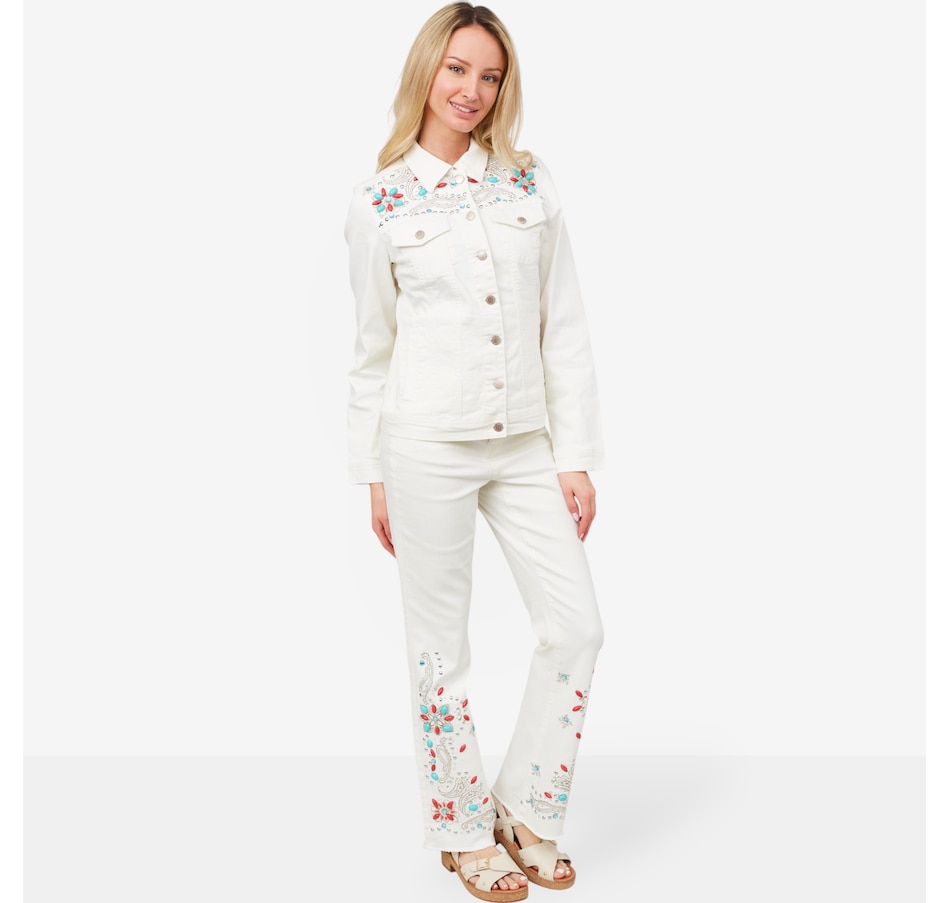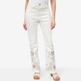 • Fitted, mid-rise, front zipper closure, belt loops, pockets, 4" stretch • Fabric: (midtone/denim) 70% cotton, 27% polyester, 2% spandex, 1% other fibre; (alabaster/fashion colour) 68% cotton, 27% polyester, 3% other fibre, 2% spandex • Care: turn garment inside out, hand wash in cold water separately using a mild detergent; do not bleach; hang to dry; warm iron on reverse if needed. • Made in China