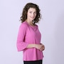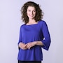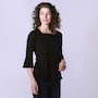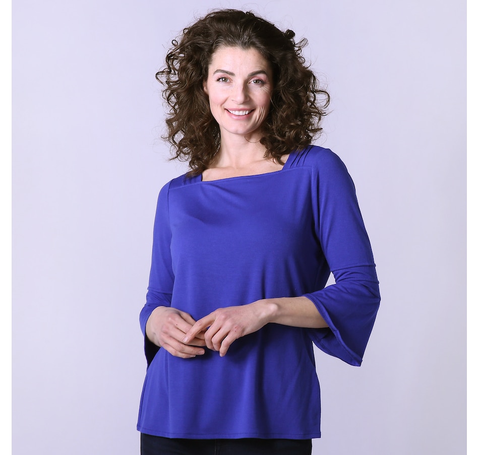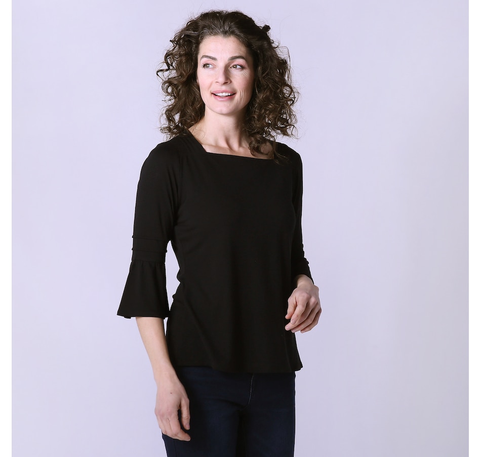 • Relaxed fit, 3/4 length ruffe bell sleeve, pull-over design, no closure, square neckline Â