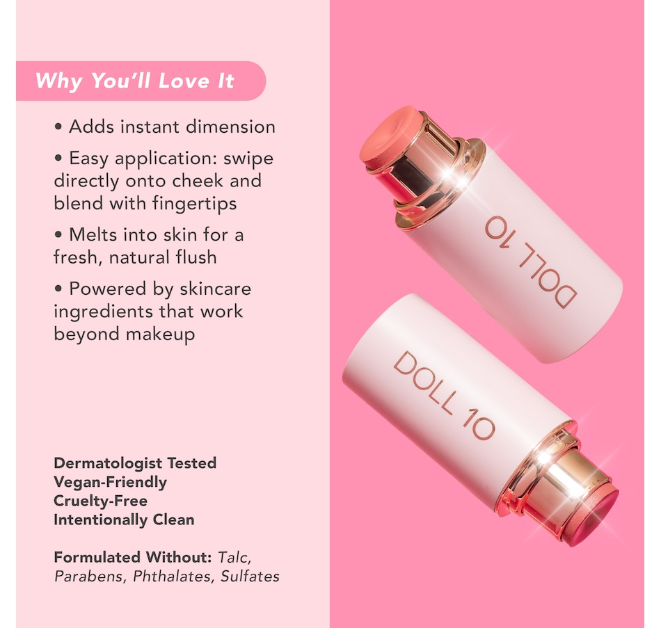 Your shortcut to a healthy, radiant flush; Doll Skin Elevate Smoothing Cheek Colour is a clean, creamy balm that melts into skin to deliver hydrating colour on the go. The breathable, buildable formula blends seamlessly for a natural finish that looks like your skin — only brighter.