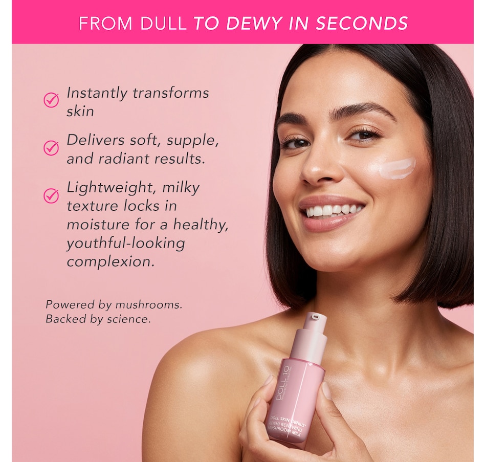 Doll Skin Genius Mushroom Milk is a hydrating & repairing skin treatment milk powered by skin-loving ingredients like reishi mushroom, lipids & hyaluronic acid that floods skin with hydration and addresses the five visible signs of aging.