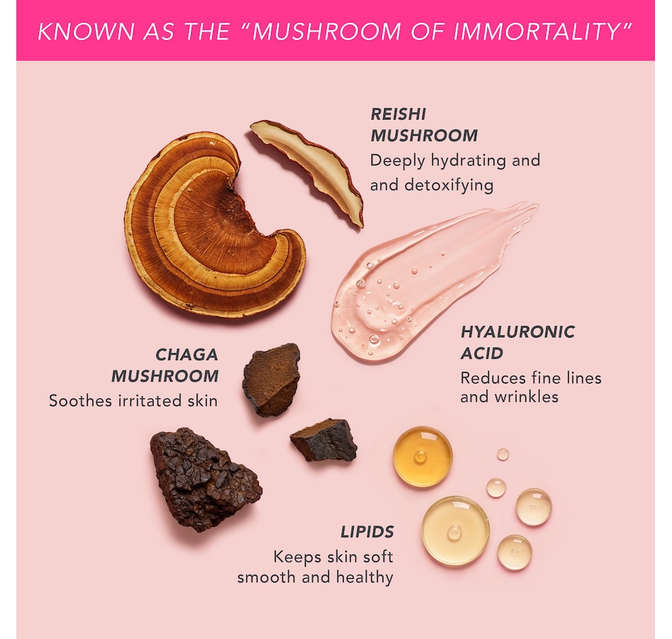 Powered by Mother Nature's most magical ingredient, reishi mushroom, this gentle yet effective formula helps hydrate and improve the overall appearance of the skin. Known as the "Mushroom of Immortality," the reishi mushroom helps diminish the appearance of fine lines and wrinkles while improving skin vitality.