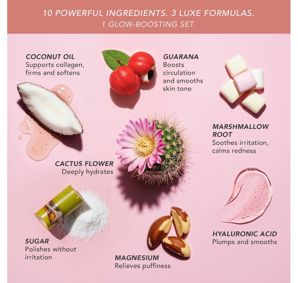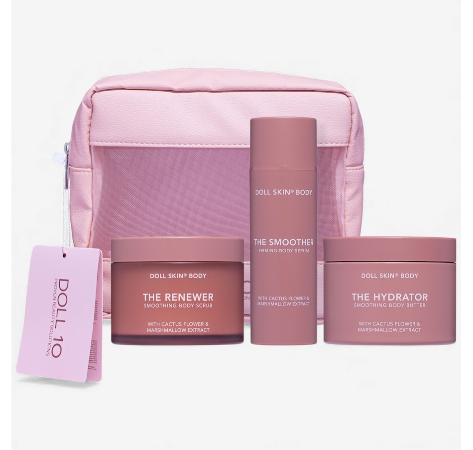 This limited edition Dollskin Body Smooth, Firm & Glow Trio with Cactus Fruit & Marshmallow Extract is a one way ticket to skin paradise. Each formula quenches thirsty skin while helping to improve the look of dry fine lines and crepiness. Intentionally clean, Cruelty-Free, Dermatologist Tested. The limited-edition, travel-friendly set includes a body scrub, a firming serum, a luxe body butter, and a bag.
