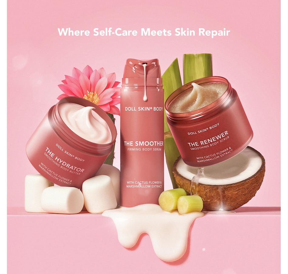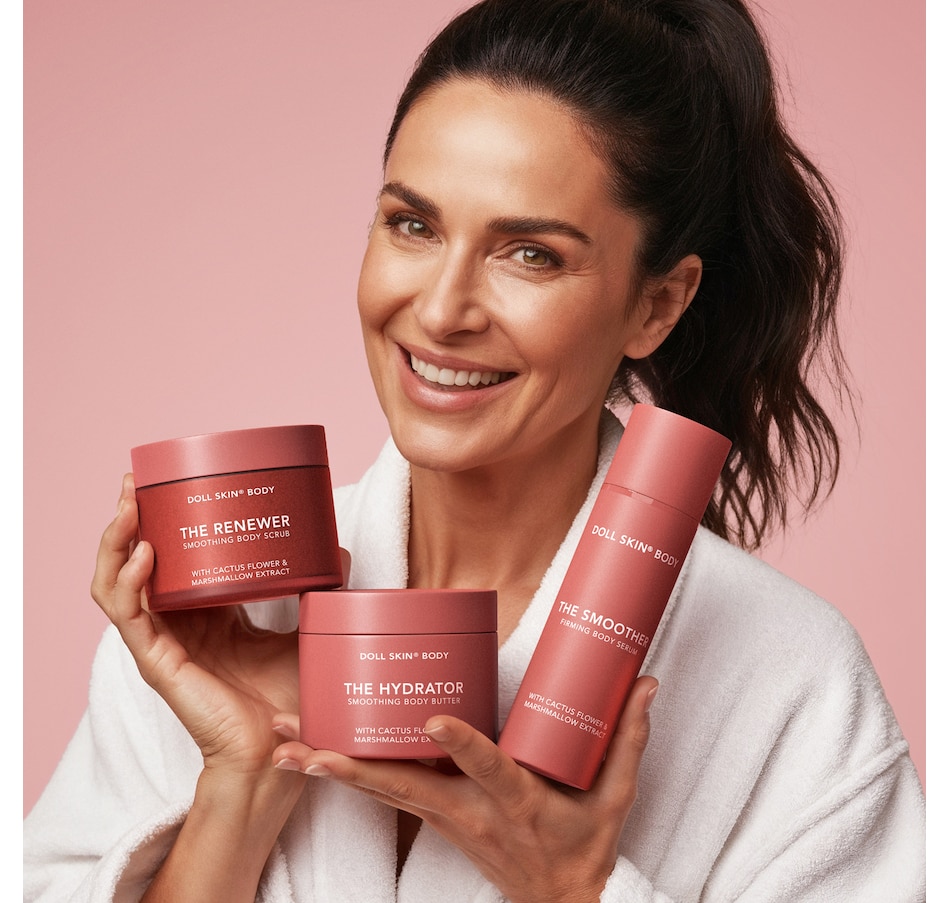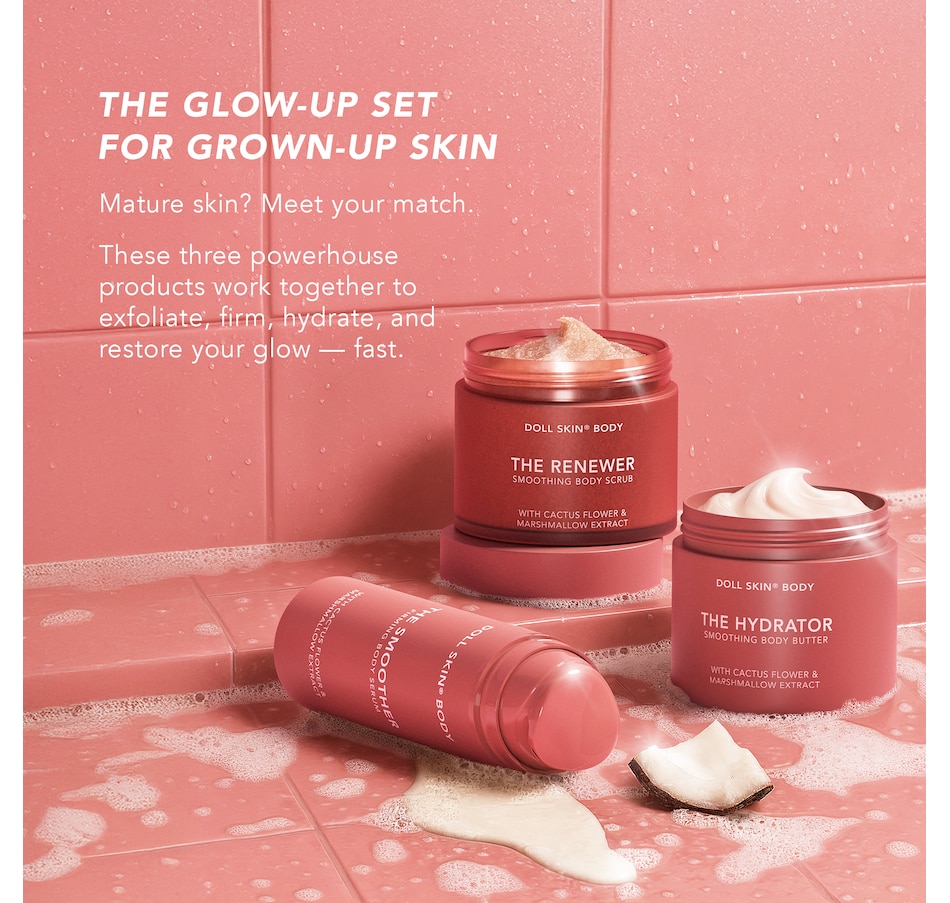 Dollskin Body trio is explicitly designed for mature, sensitive skin. The clean and cruelty-free formulas are powered by skin-loving ingredients and formulated without 1,300 known toxins to smooth & quench thirsty skin. Skin-loving ingredients include: Cactus Flower & Lipids to deeply hydrate and retain moisture; Marshmallow Extract & Peptides to promote elasticity; Guarana & Coconut Oil to visibly smooth, brighten, and firm while supporting a strong skin barrier.