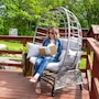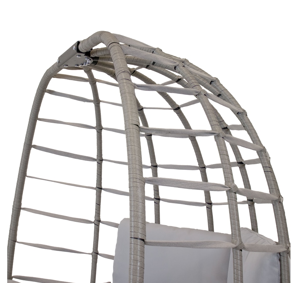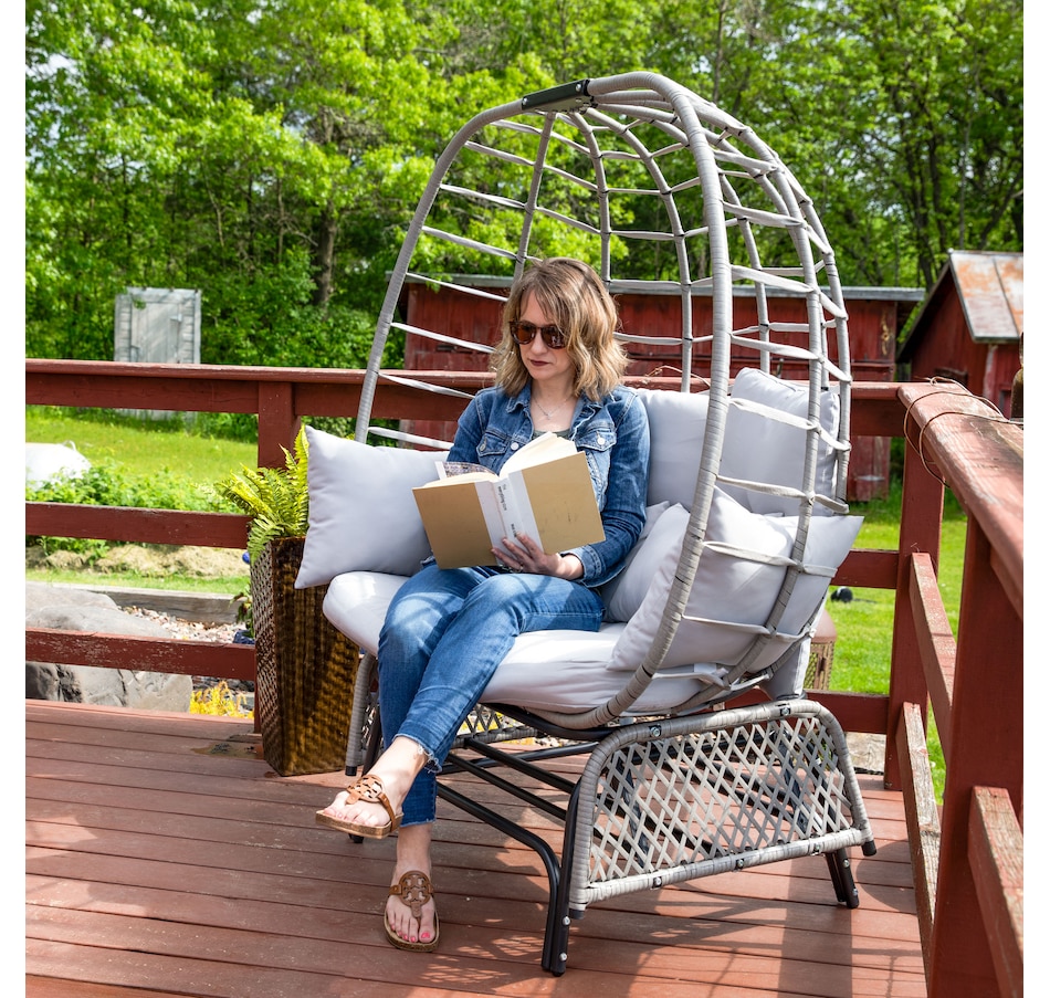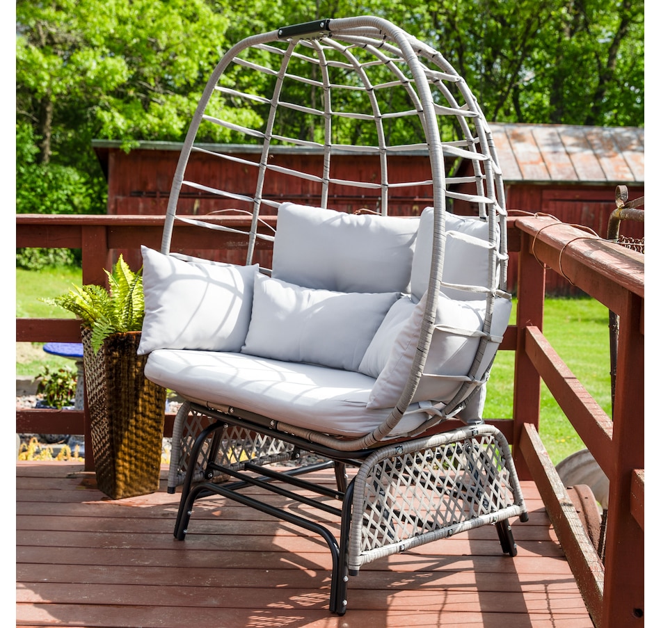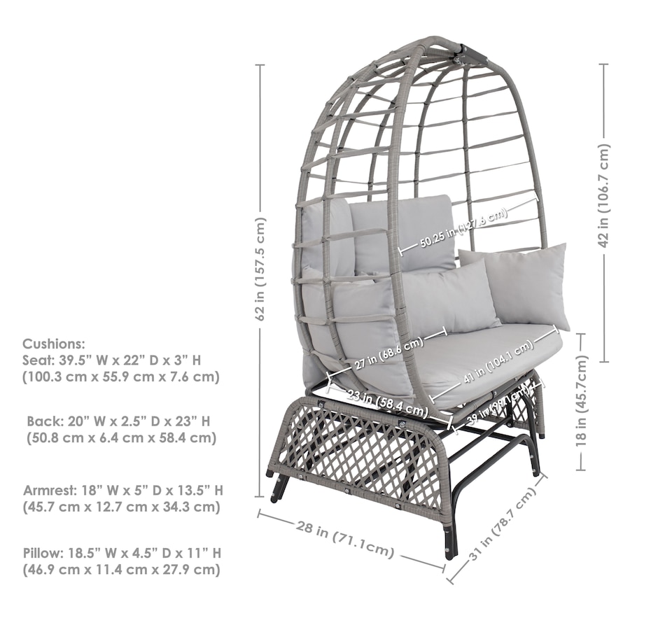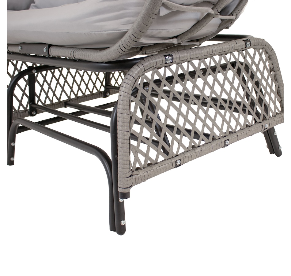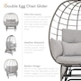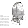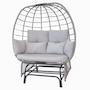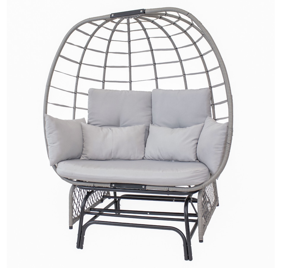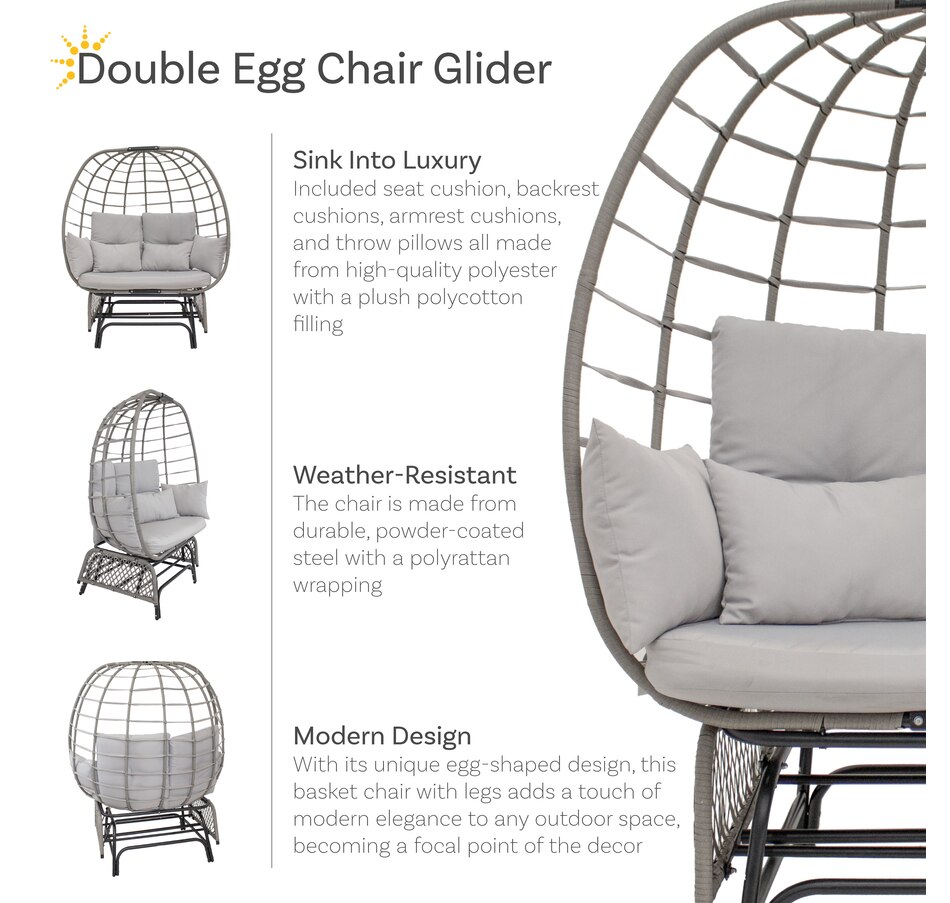 Introducing the outdoor egg rocking chair glider, the epitome of comfort and style for outdoor relaxation needs. Crafted with a sturdy steel frame wrapped in durable polyrattan, this oversized rocking egg chair is built to withstand the elements while providing a cozy retreat in outdoor spaces. Sink into luxury with the included seat cushion, backrest cushions, armrest cushions, and throw pillows all made from high-quality polyester with a plush polycotton filling. These cushions offer exceptional comfort and support, ensuring comfortable lounging for hours. This 2-person egg chair glider features a smooth gliding motion for gently swaying back and forth to unwind in nature's embrace. Whether sipping a coffee in the morning, catching up on a favorite book, or simply enjoying the beauty of the outdoors, this chair provides a wonderful spot for relaxation. With its modern design and superior comfort, the outdoor egg chair glider is sure to become the focal point of the patio, deck, porch, or yard.