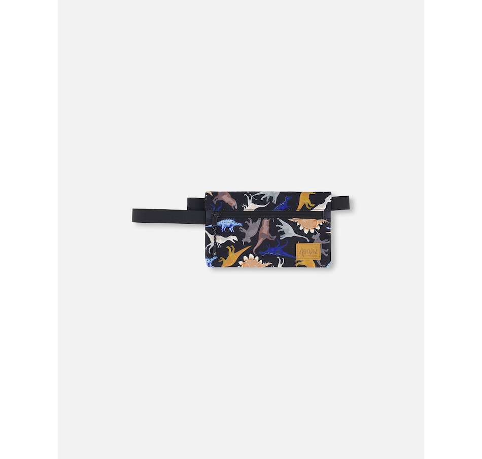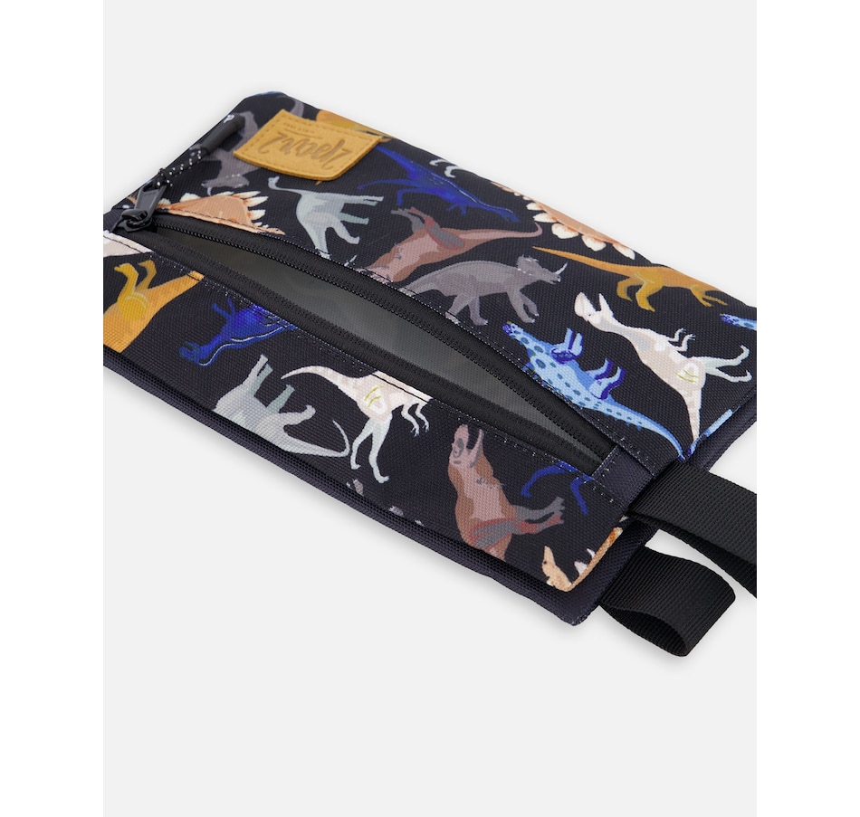 Stash pencils, pens, erasers, and other essential school supplies inside this allover print stationery pouch. Detailed with an allover black dinosaur print, this pencil case features two separate zippered compartments, a convenient grab handle, and a logo patch on the front. Team it with a matching lunch box and school bag for a perfectly coordinated look!