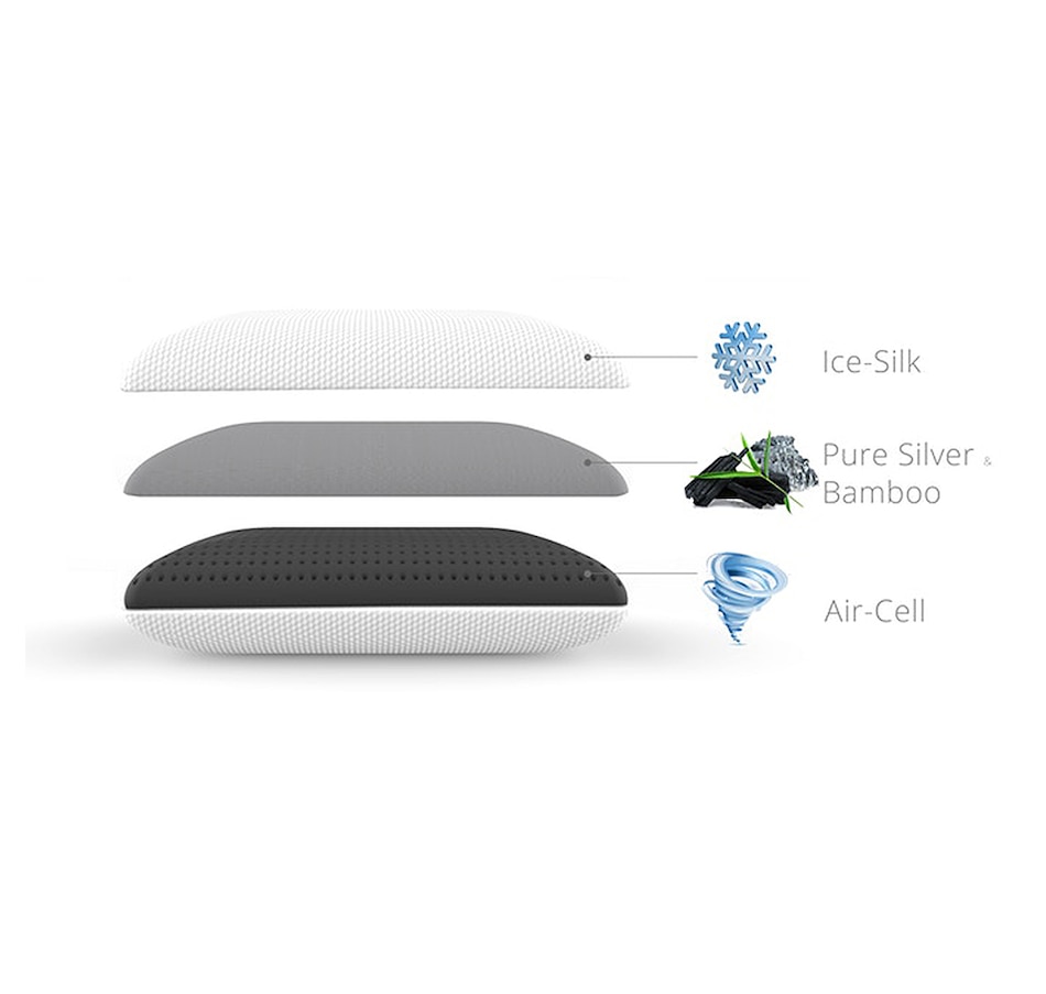 The Z-Cool is a carbon-infused memory foam pillow, with air cell breathability, ultra soft bamboo, pure silver fibres, and ice silk technology for instant coolness. The Cooling Ice technology helps wick away moisture and body heat to help you feel cooler so that you can fall asleep faster.