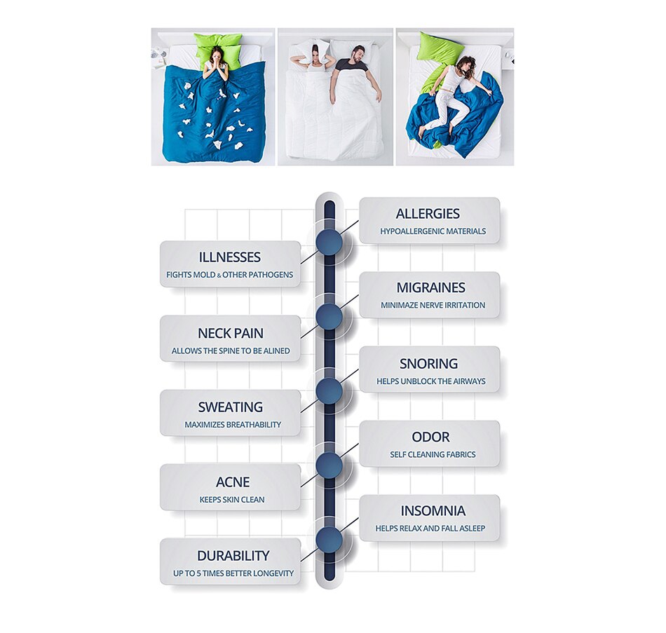 Silver has been used by NASA, US Special Forces, and Olympic athletes to create germ free textiles. Bamboo charcoal’s activated carbon absorb toxins, prevents mold growth, and purifies air by absorbing harmful gasses. Air cells increase comfort and breathability that is linked to sweating and snoring during sleeping. The combination of these textiles wick moisture away twice as fast as cotton, reducing the humidity in your bed by up to 50%.