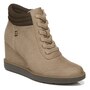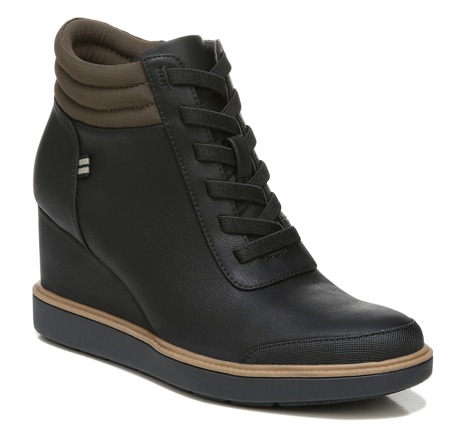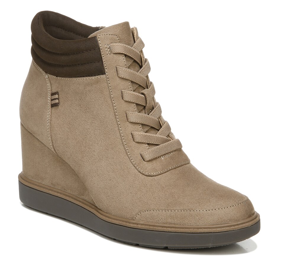 STYLE: hiking-inspired sneaker boot with puffed comfort collar, stretch laces, 3 inch wedge heel, and durable lug sole.
