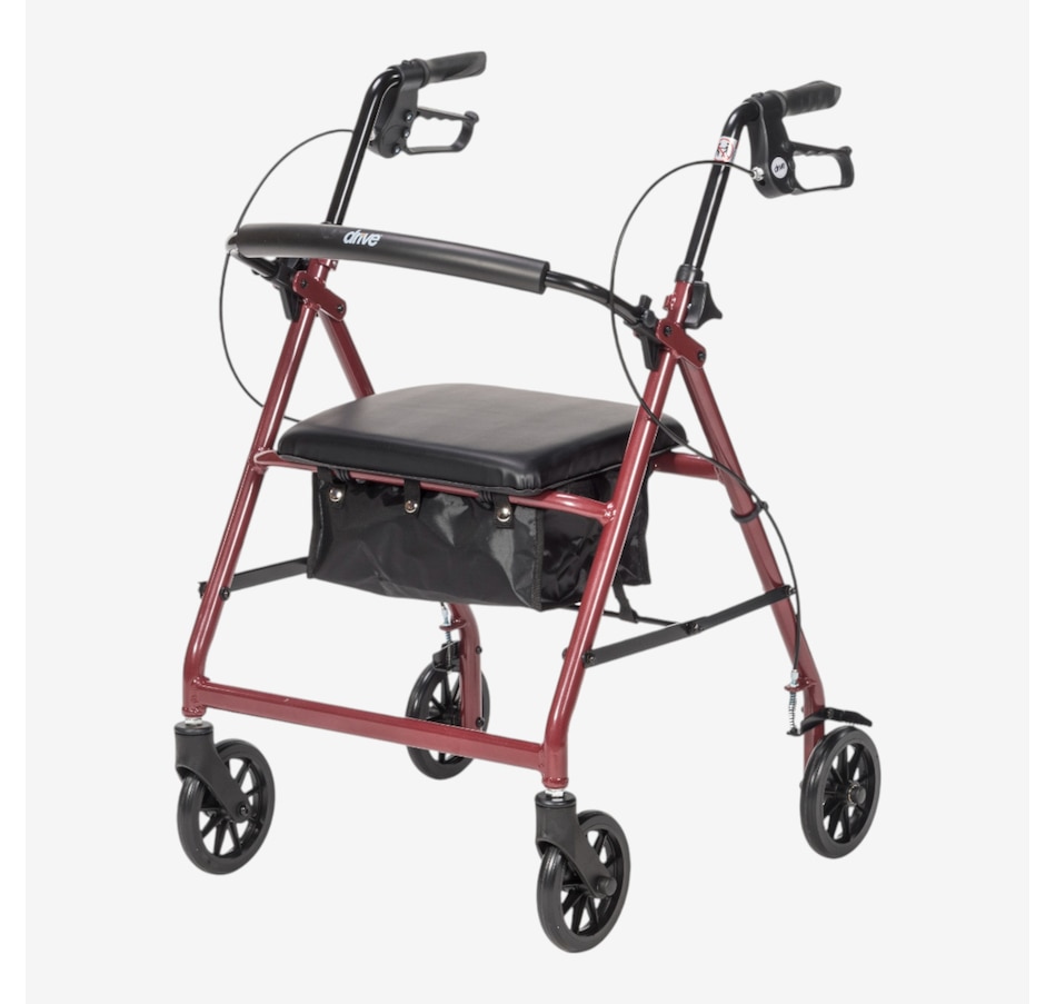 The Walker Rollator with 6" Wheels, Fold Up Removable Back Support, and Padded Seat by Drive Medical comes standard with 6" caster wheels, loop locks and serrated brakes to ensure safety. The seamless padded seat opens to a roomy, convenient, zippered storage pouch for easily and securely transporting personal items, and the ergonomic handles are easy to grip, relieve hand pressure, and are height-adjustable.