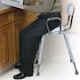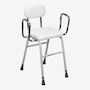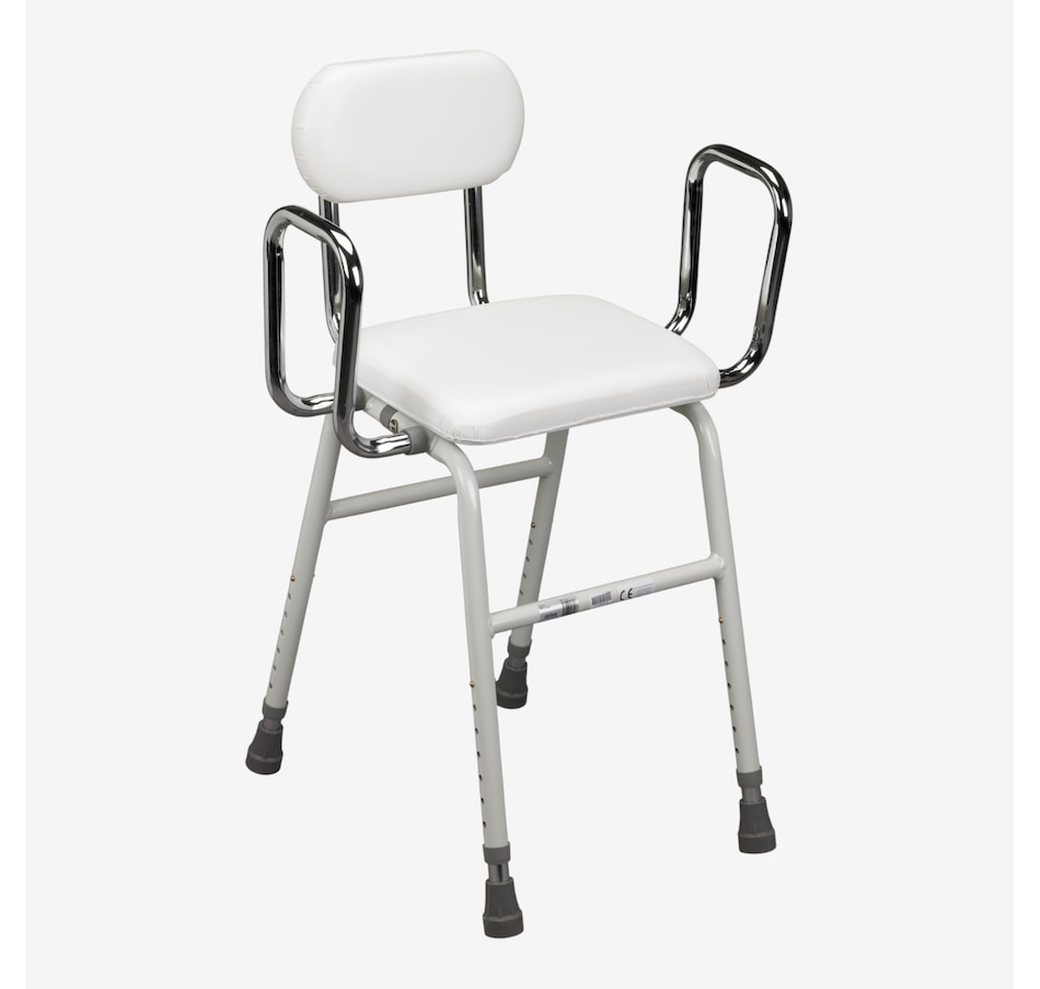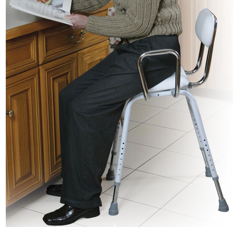 This all-purpose kitchen stool by Drive Medical is convenient and comfortable for everyday use. Perfect for use as a hip-high chair after surgery or as an adjustable chair for individuals who cannot use standard-height seating, the adjustable stool features a padded seat and back for added comfort and an angled seat that makes sitting down and getting up easy. This stool also comes standard with removable arm supports with adjustable width and height to accommodate most individuals. Manufactured with white powder-coated steel and chrome-plated legs for an attractive, durable finish, this kitchen stool is tool-free and easy to assemble.