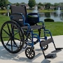 The armrests are fully padded, and the frame, black cross brace, and the nylon upholstery are durable, attractive and easy to clean. The tires, made of solid rubber, offer exceptional durability. If that wasn't enough, this leading-edge mobility aid also requires little to no maintenance. Users also appreciate that the Blue Streak Wheelchair comes with easy-to-operate push-to-lock brakes, along with convenient elevating leg rests that allow you, the user, to safely, effortlessly and with convenience, slide in and out of your chair.