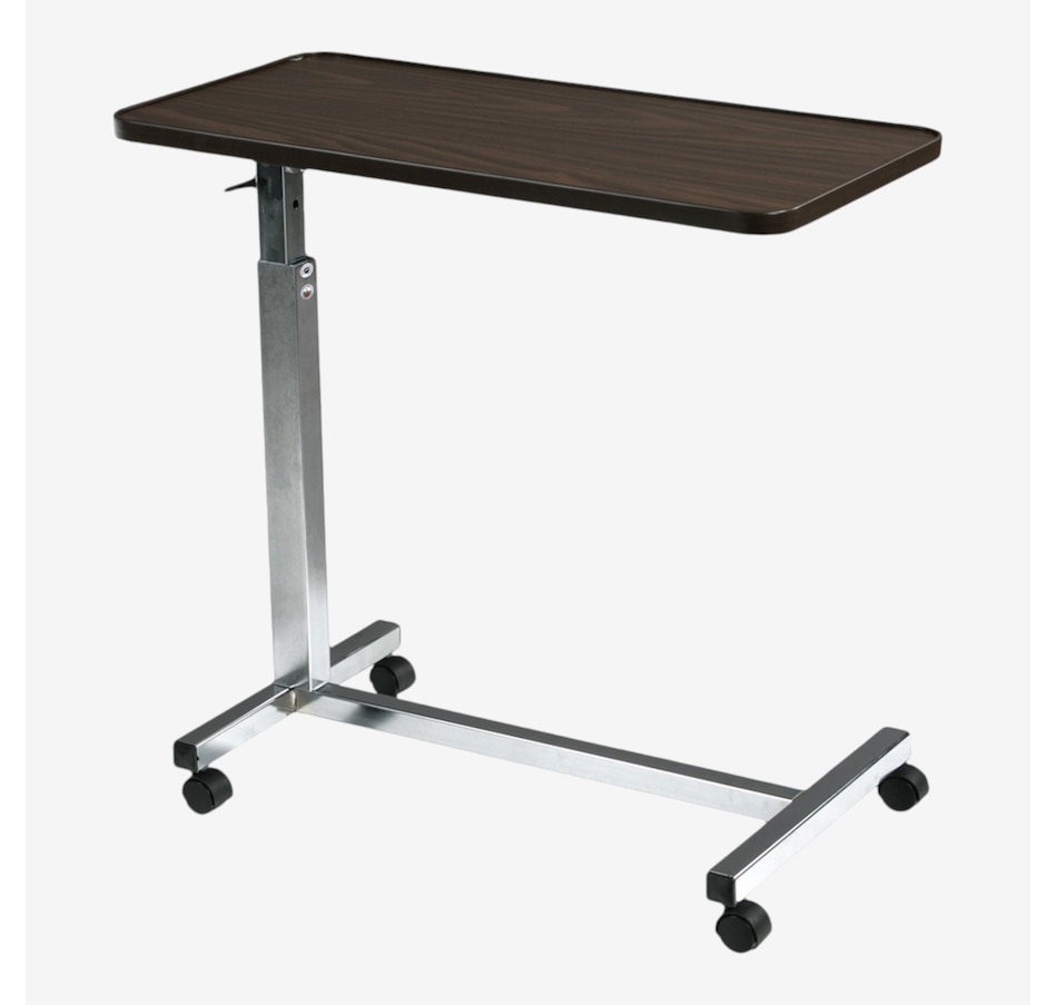 The walnut, wood-grain low-pressure laminate top on this deluxe tilt-top table by Drive Medical tilts 33 degrees in either direction, giving you the ability to adjust the overbed medical table to suit your needs. With the slightest upward pressure, the overbed table with wheels can be raised or lowered to an infinite number of settings between 26.5 and 46 inches, and the top locks securely when the height adjustment handle is released. Chrome-plated steel "H" base provides added stability and security and leads to swivel casters, which allow for maneuverability.