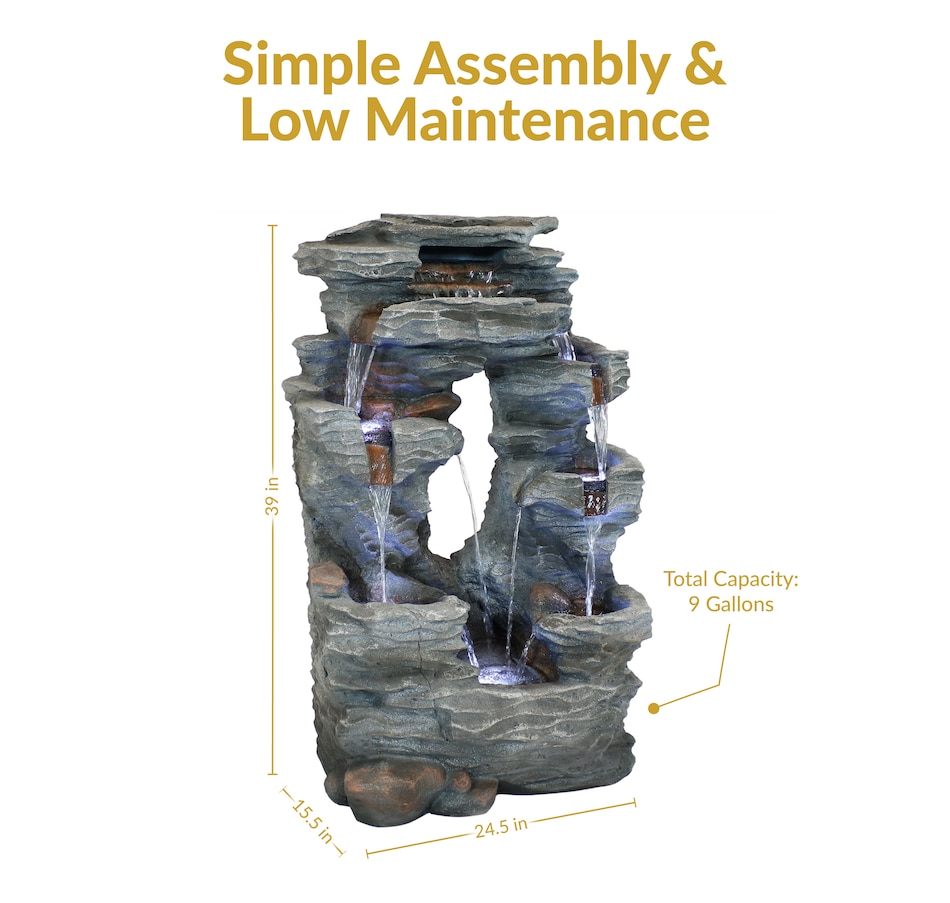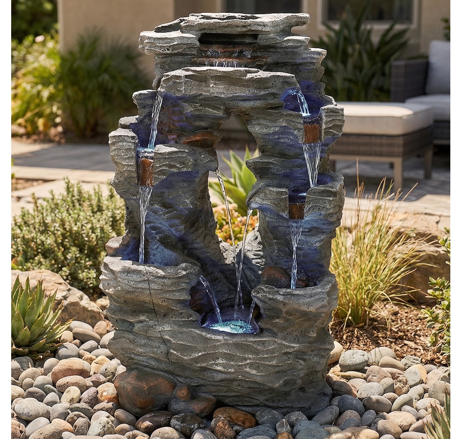 Enjoy the beautiful sights and soothing sounds of this outdoor water fountain. Watch the mesmerizing falling water as it tumbles over the rocks. This garden fountain is made of lightweight yet durable polyresin and features a natural stone appearance to complement any outdoor setting. Staying strong against the elements, this fountain also remains lightweight so it is easy to place anywhere desired. Plus, it's easy to set up. Simply place in the yard, garden, or other outdoor space, put the pump in the fountain, fill it with water, plug the pump into an outlet, and it's ready to go. Surround it with landscaping, bushes, or potted plants to adore this attractive, soothing fountain throughout the day and even into the evening. Built-in LED lights on the bottom of each tier illuminates any space with relaxation and style.