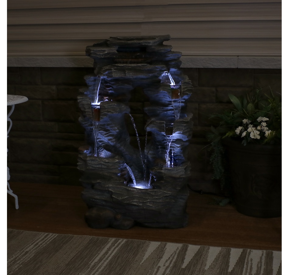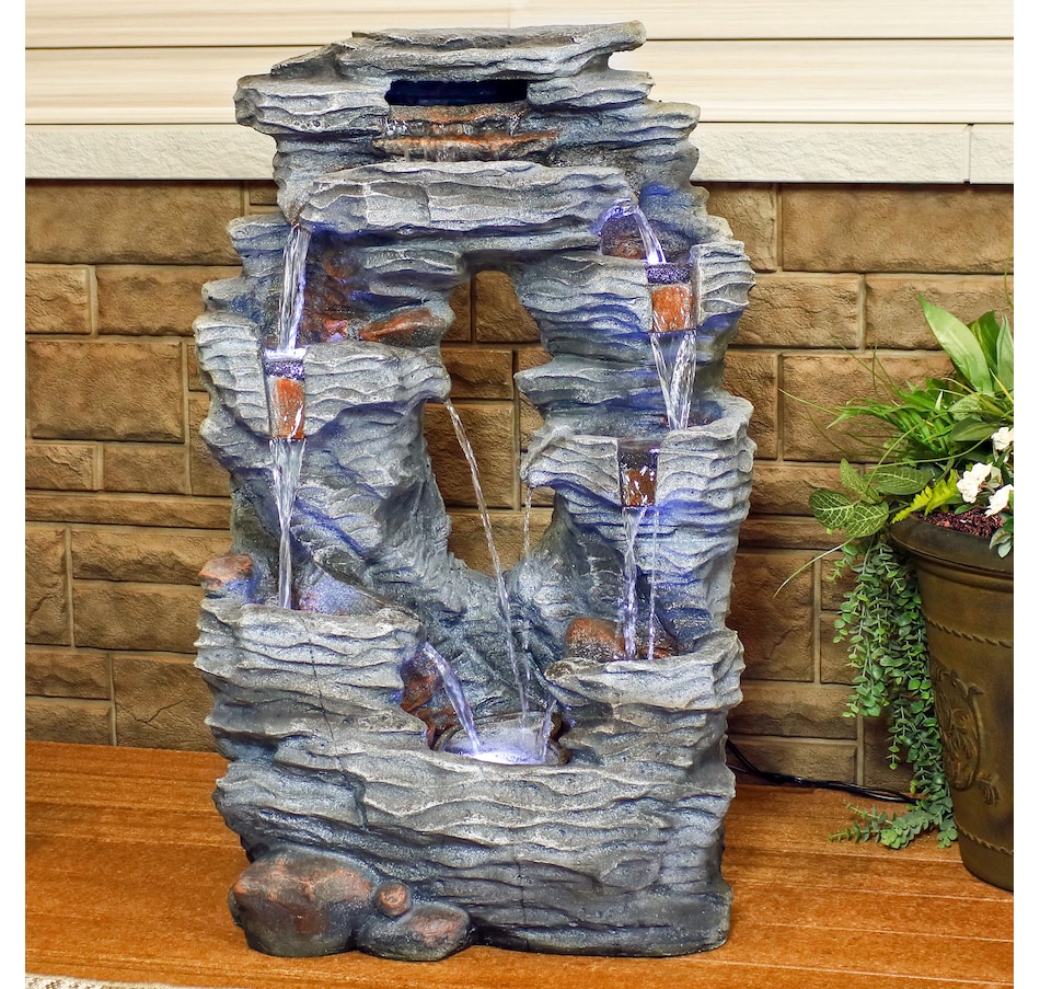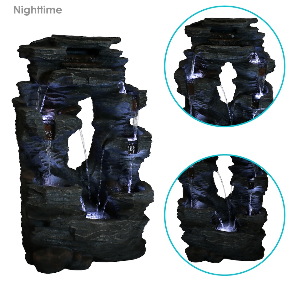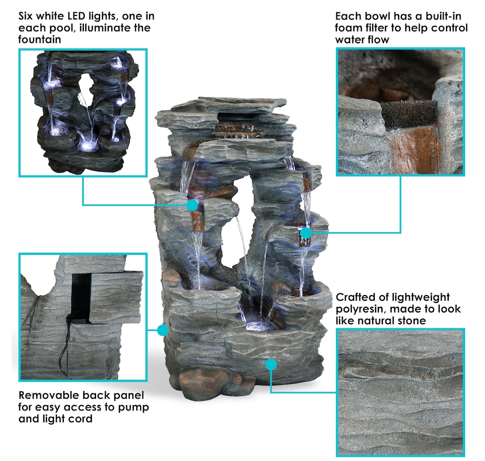 Enjoy the beautiful sights and soothing sounds of this outdoor water fountain. Watch the mesmerizing falling water as it tumbles over the rocks. This garden fountain is made of lightweight yet durable polyresin and features a natural stone appearance to complement any outdoor setting. Staying strong against the elements, this fountain also remains lightweight so it is easy to place anywhere desired. Plus, it's easy to set up. Simply place in the yard, garden, or other outdoor space, put the pump in the fountain, fill it with water, plug the pump into an outlet, and it's ready to go. Surround it with landscaping, bushes, or potted plants to adore this attractive, soothing fountain throughout the day and even into the evening. Built-in LED lights on the bottom of each tier illuminates any space with relaxation and style.