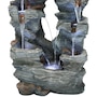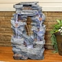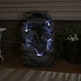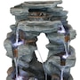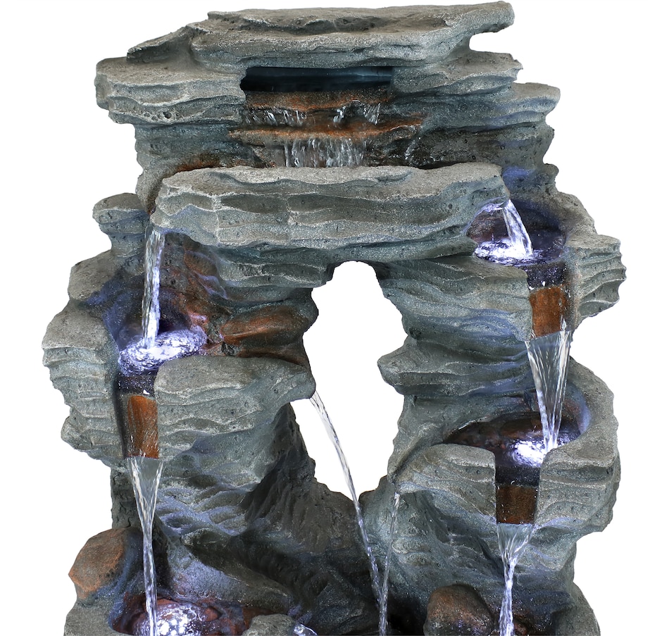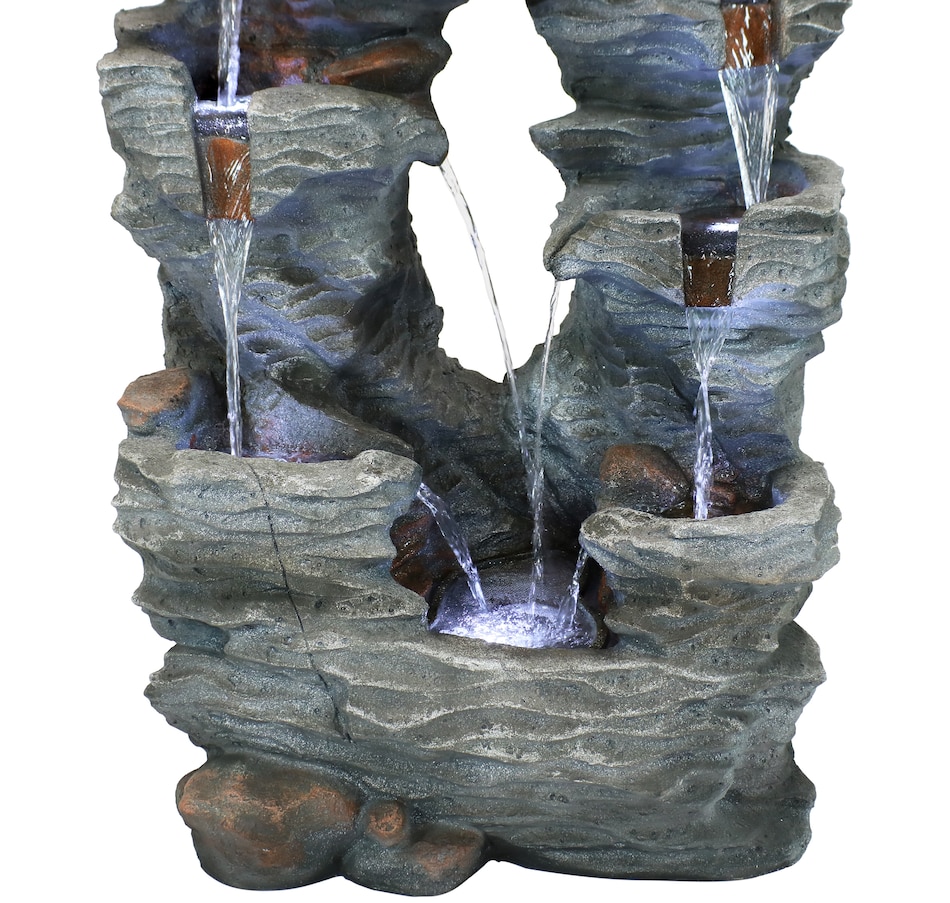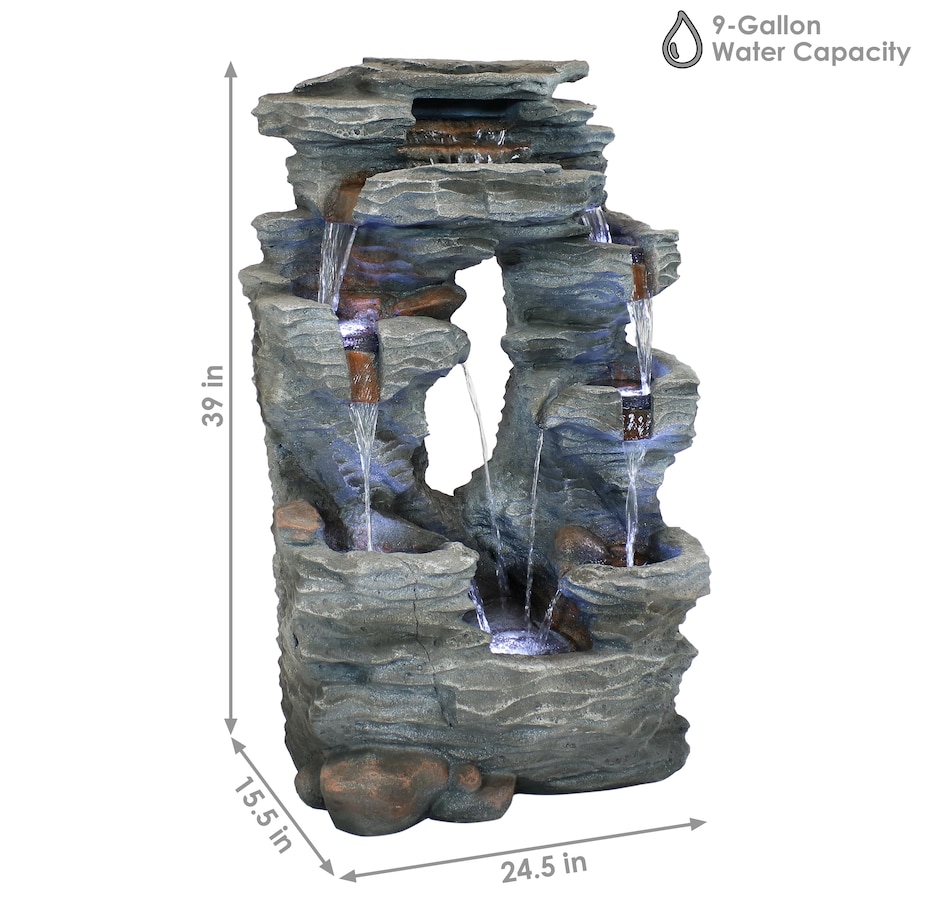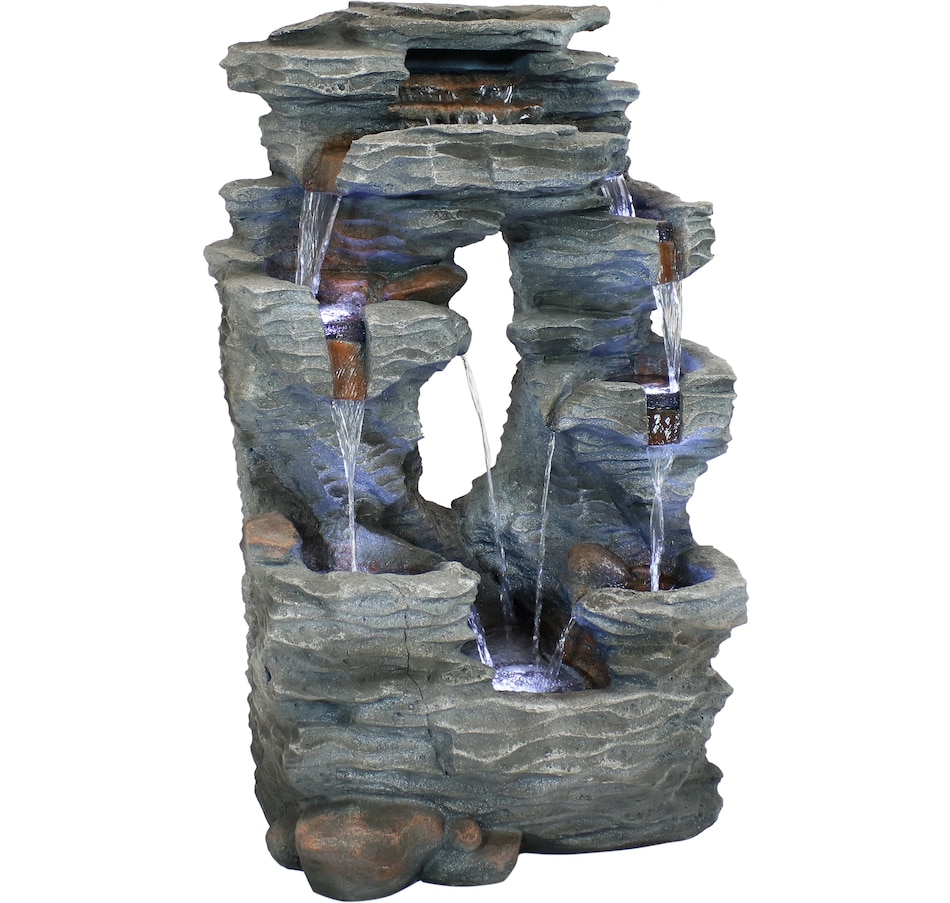 Enjoy the beautiful sights and soothing sounds of this outdoor water fountain. Watch the mesmerizing falling water as it tumbles over the rocks. This garden fountain is made of lightweight yet durable polyresin and features a natural stone appearance to complement any outdoor setting. Staying strong against the elements, this fountain also remains lightweight so it is easy to place anywhere desired. Plus, it's easy to set up. Simply place in the yard, garden, or other outdoor space, put the pump in the fountain, fill it with water, plug the pump into an outlet, and it's ready to go. Surround it with landscaping, bushes, or potted plants to adore this attractive, soothing fountain throughout the day and even into the evening. Built-in LED lights on the bottom of each tier illuminates any space with relaxation and style.