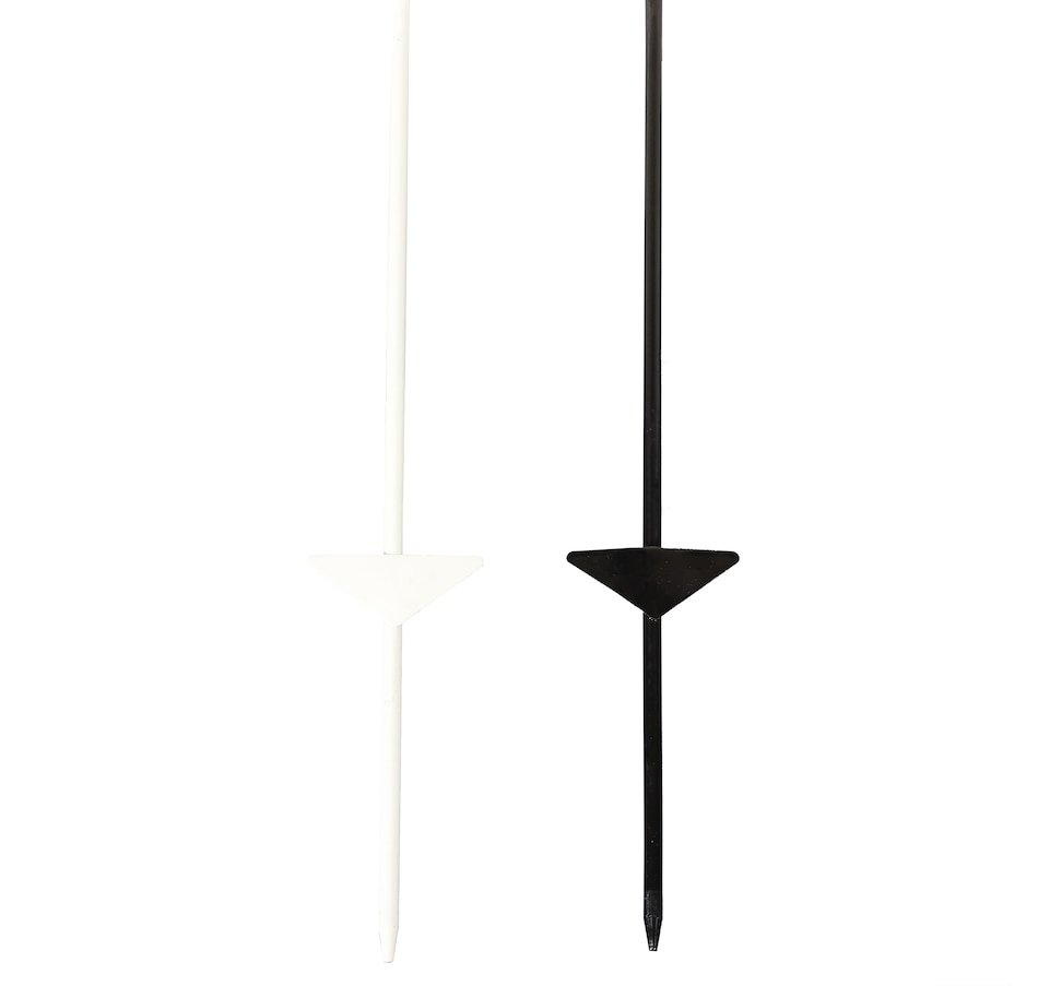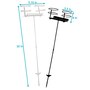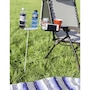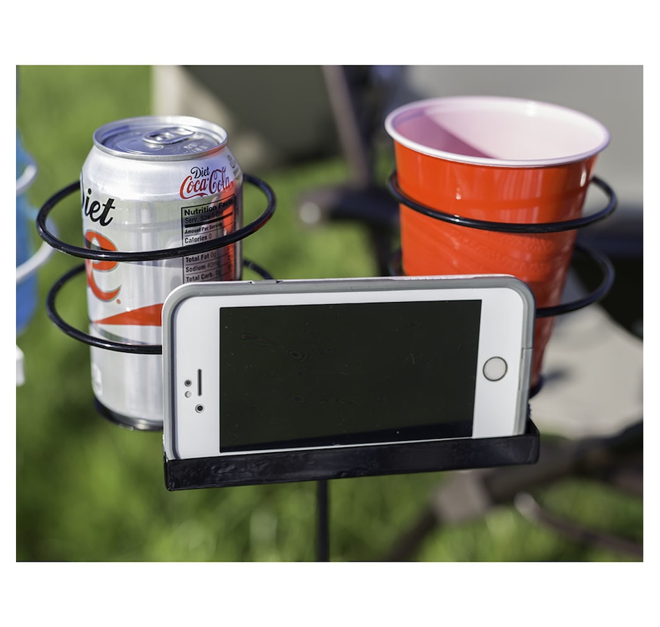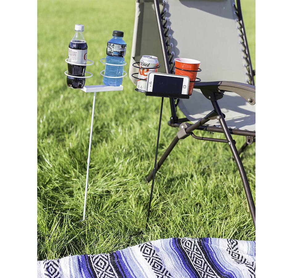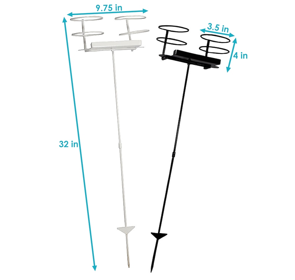 Keep drinks and phones off the ground with this outdoor drink holder stake set of two. Designed for convenience and built to last, each stake is made from 1/4" solid steel with a powder-coated finish that resists rust and withstands outdoor conditions. Standing 32" tall, these stakes keep beverages within easy reach and hold a wide range of containers, including wine bottles, tumblers, soda cans, thanks to the 3.5" inner diameter ring. Each holder also features a built-in phone tray measuring 6" wide by 3.25" deep with a 0.5" lip to keep devices safe and visible while relaxing outside. The black and white finishes blend effortlessly with any outdoor setup, from campsites and picnic areas to backyard fire pits and patios. The 2-piece design twists together easily and disassembles quickly for compact storage and transport. Whether used during lawn games, beach days, or a quiet hammock session, this set adds both function and style to any outdoor hangout.