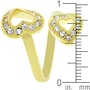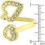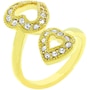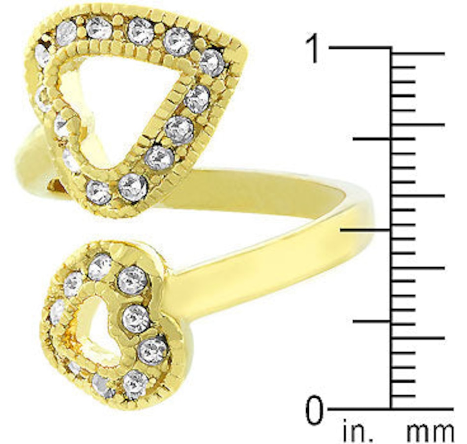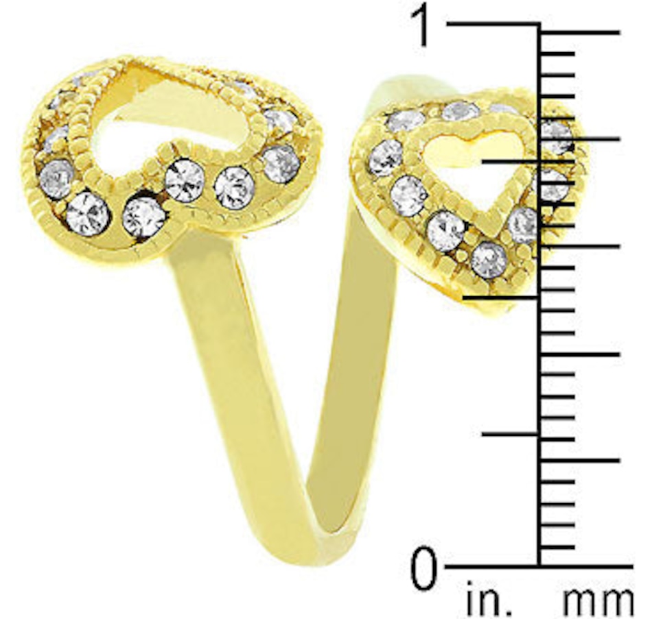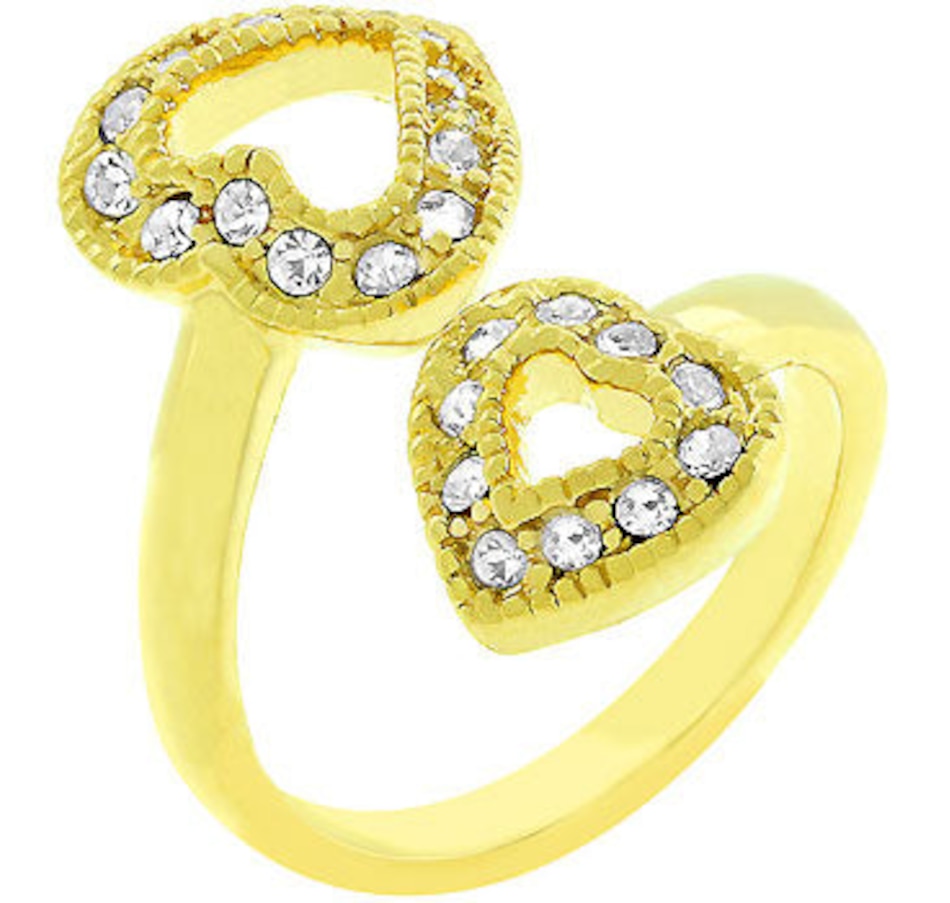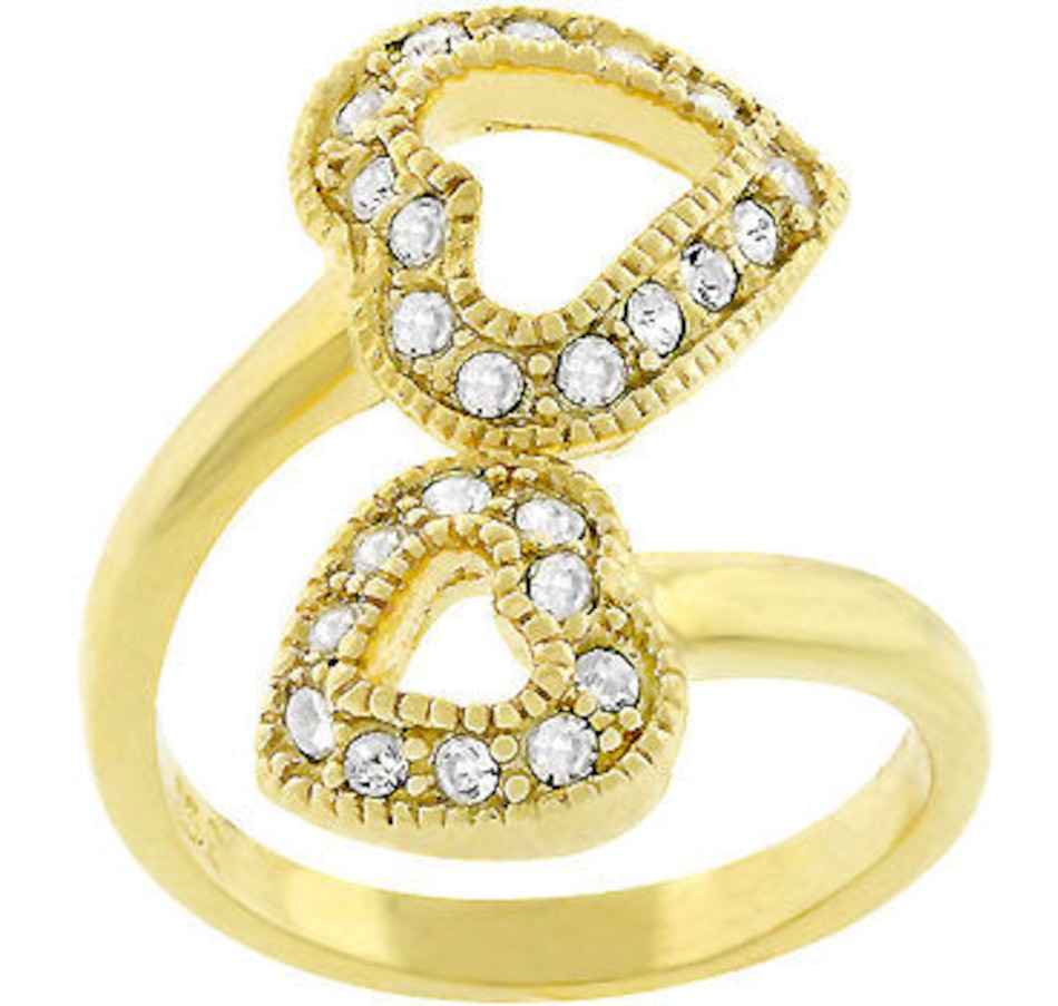 The Dual Hearts Ring is fashioned with 18k gold overlay and with handset crystals. 18k plated gold is achieved using an electroplating process that coats the item with heavy layers of 18k Gold and color-treated to display a perfect 14k Hamilton gold color.