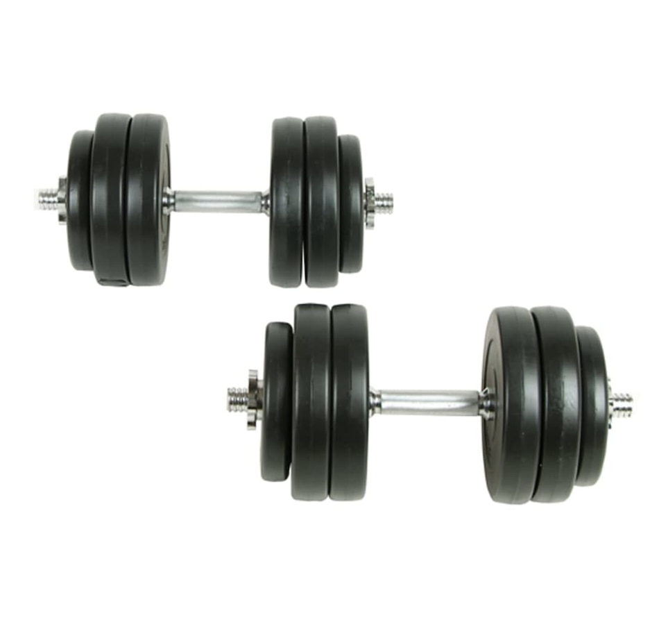 The kit contains 2 dumbbells of 15 kg each. The weights included vary between 1.25 kg and 2.5 kg, which allows you to choose the appropriate weight for your type of exercise. The non-slip handles ensure a good grip on the bar, the screw closures prevent sliding discs. You can easily combine the bar and weights with equivalent items from our selection.