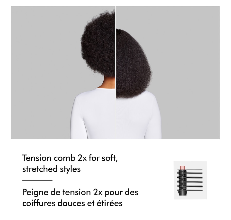 • Straighter styles using air with the Tension Comb 2x attachment; additional side bristles increase tension for a straighter finish