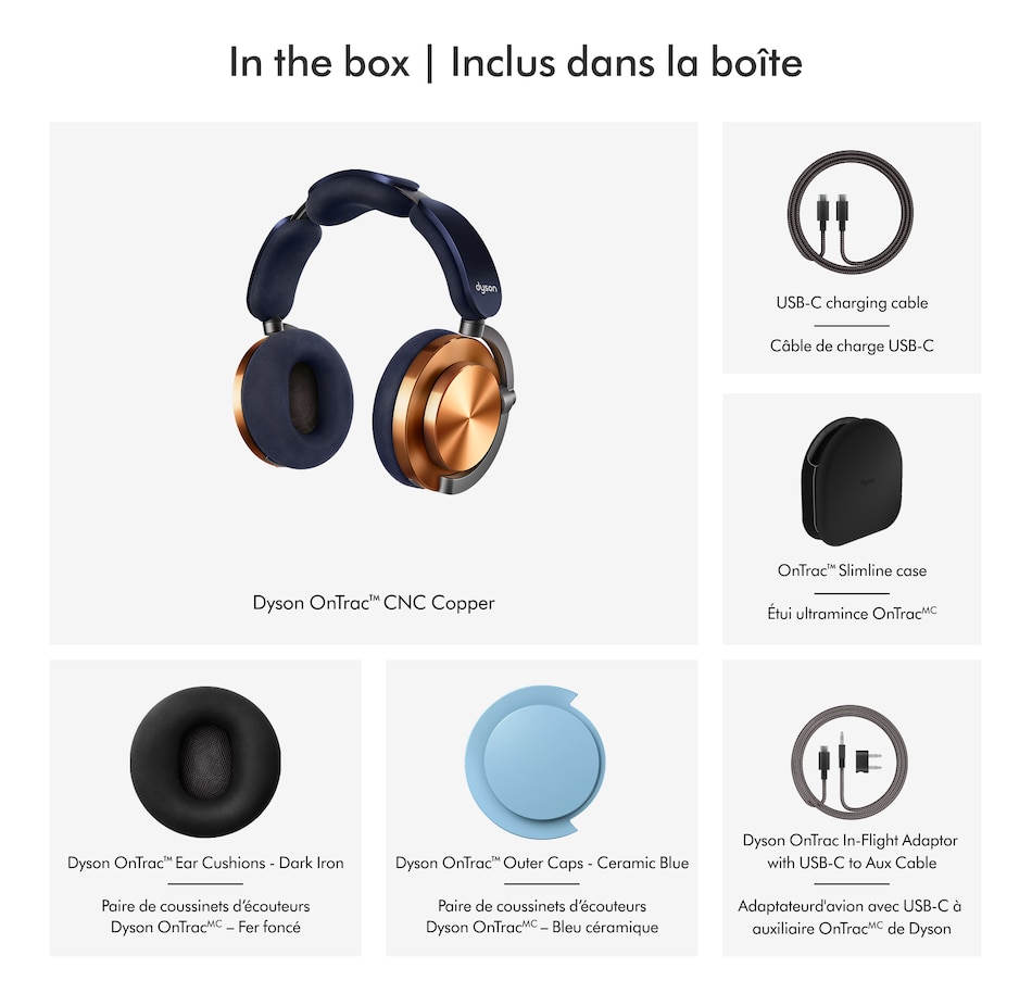 Pioneered with precision, Dyson OnTrac headphones offer best-in-class noise cancellation with enhanced sound range and are engineered for comfort with soft microfibre cushions and even weight distribution. Hear every detail with eight active noise cancelling microphones combined with passive attenuation for fully immersive listening. This exclusive bundle includes Dyson OnTrac CNC Copper headphones, the Dyson OnTrac In-Flight Adapter Kit, a pair of Dyson OnTrac Ear Cushions in dark iron and a pair of Dyson OnTrac Outer Caps in ceramic blue.