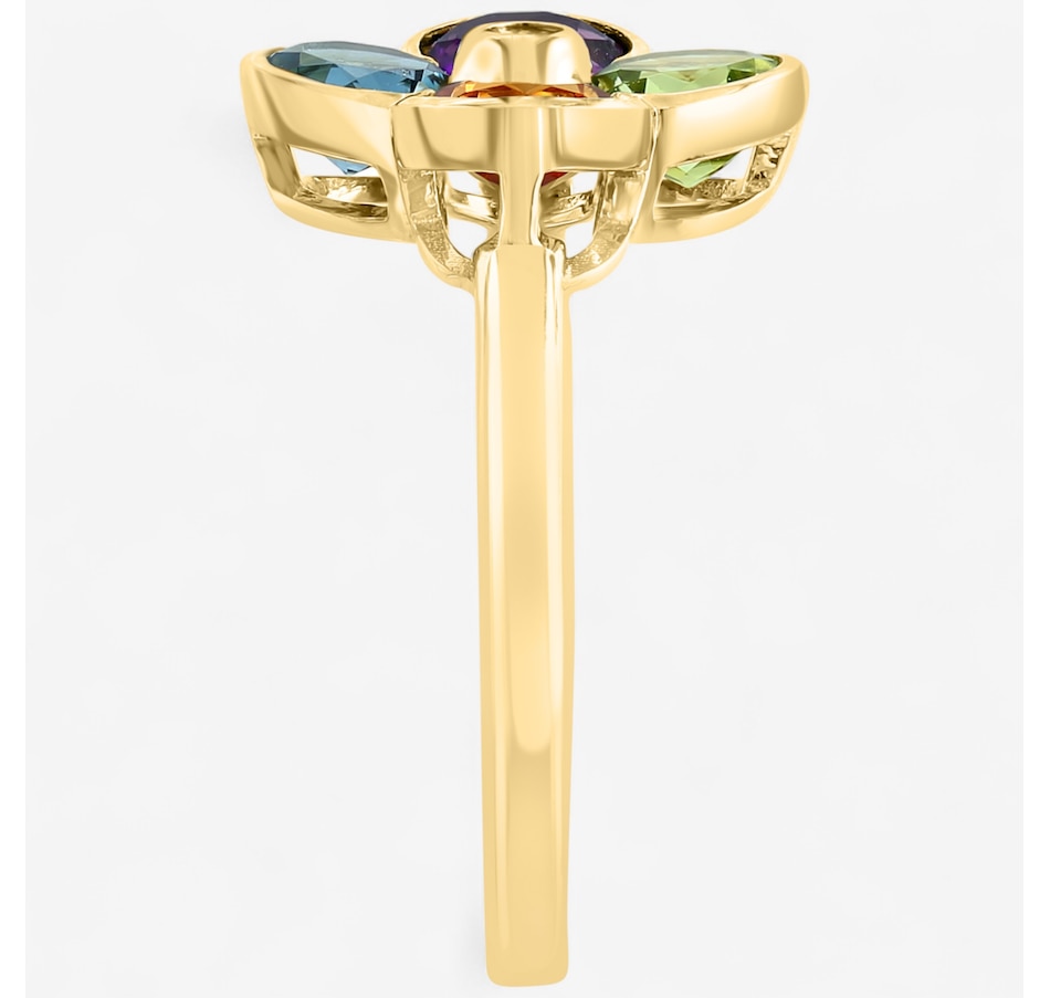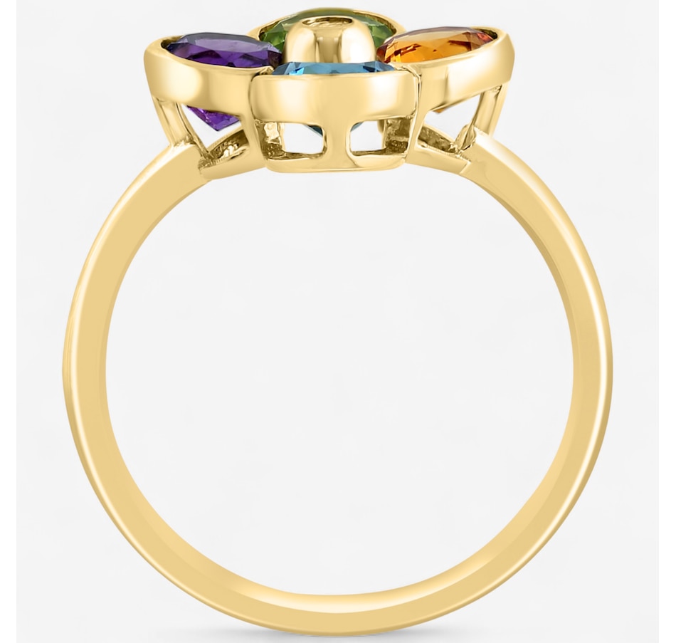 • (1) amethyst (0.48 ctw), (1) London blue topaz (0.60ctw), (1) citrine (0.48 ctw), (1) peridot (0.57ctw), 5mm round shape, bezel set and faceted (1) round shape, bezel set and faceted diamond (0.02 av. ctw)