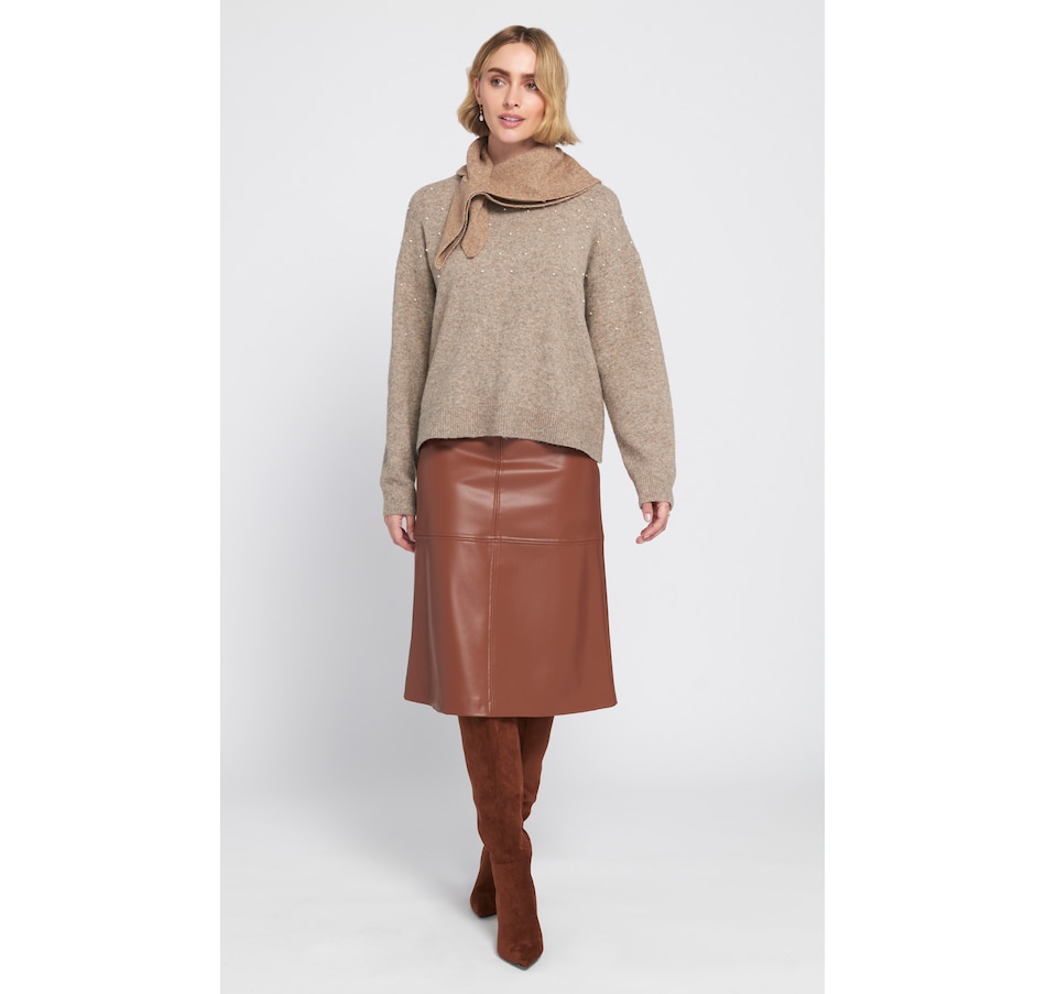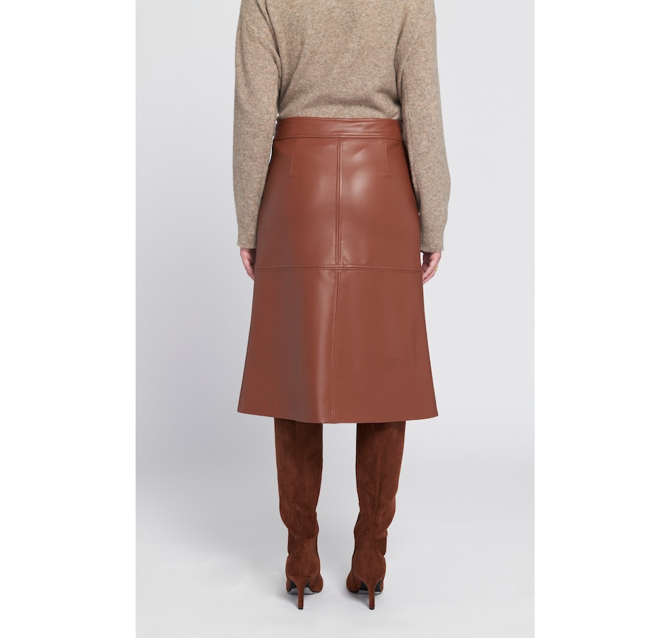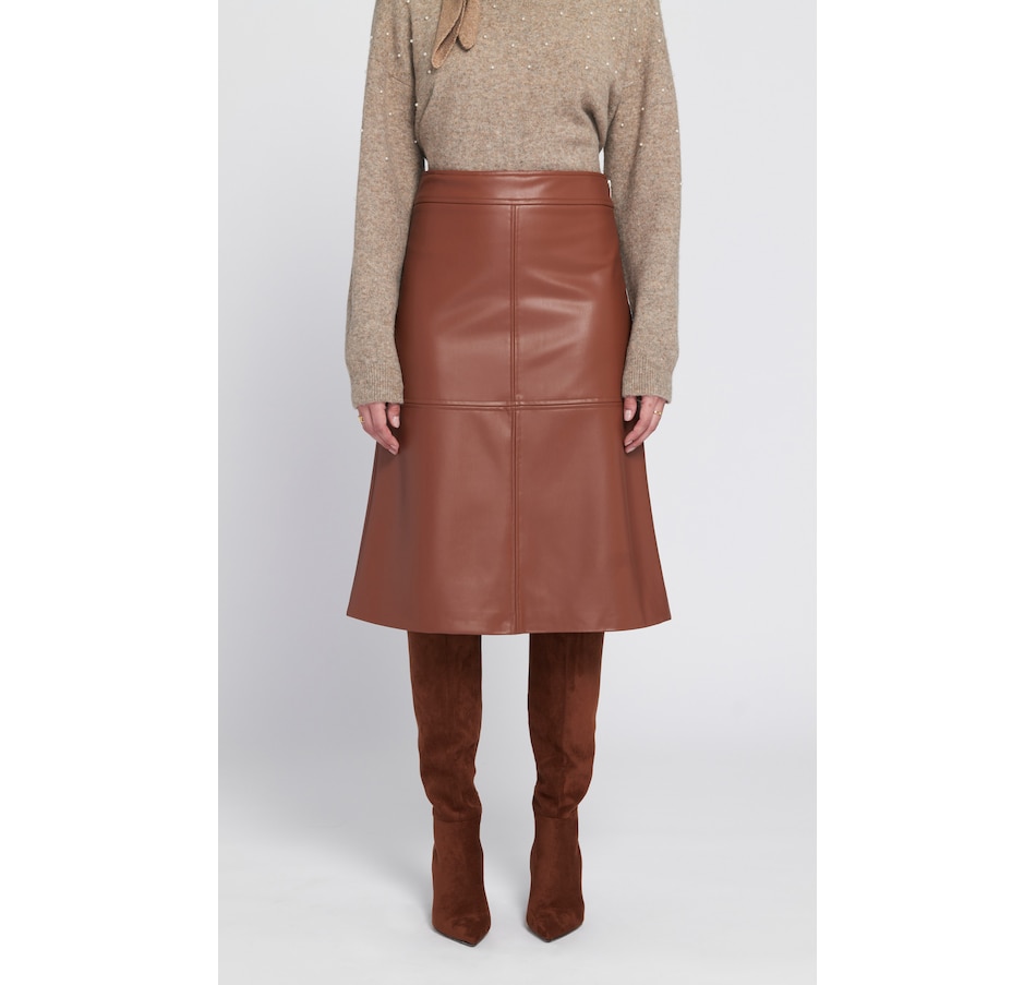 Versatile with a touch of sophistication, you'll elevate your fall look in style with the Aline faux leather skirt from ELLE. The a-line silhouette creates a flattering, structured shape, and the smooth faux leather has a subtle sheen for a modern edge. Its clean paneled construction enhances the tailored look, and its mid-length hem is ideal for pairing with tall boots or heels.