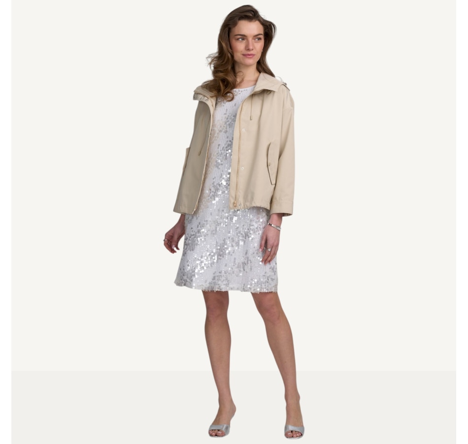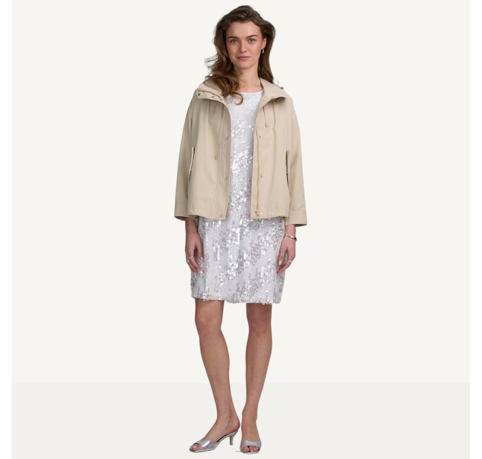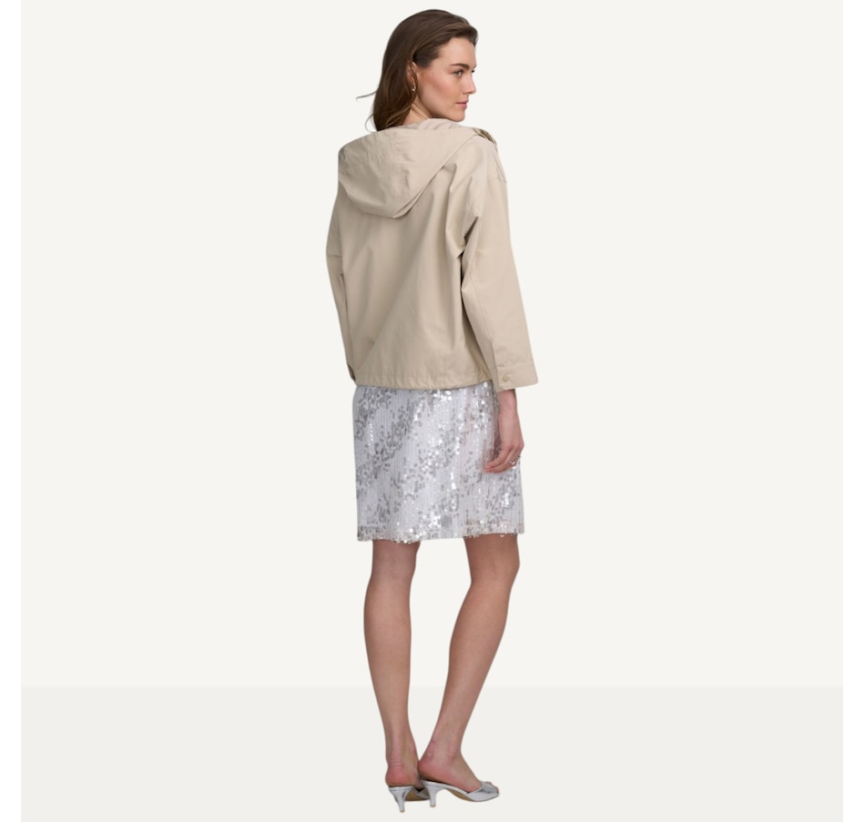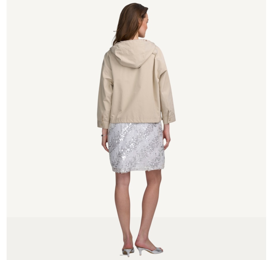 Bring modern ease and everyday versatility to your wardrobe with this beautifully designed cropped jacket — the perfect blend of style, comfort, and practicality. Its cropped length creates a fresh, contemporary silhouette that layers effortlessly over casual basics or dressier looks, while the soft neutral fabric offers a polished finish without sacrificing lightweight comfort. An attached hood with functional drawcords adds adjustability and protection in light weather, and the secure zipper‑and‑snap front closure gives you styling flexibility on the go. The relaxed fit provides comfortable movement and makes room for layering, while long sleeves with clean cuffs keep the overall look minimal and refined. Finished with sleek front welt pockets for subtle functionality, this semi‑fitted jacket is the easy, elevated layer you’ll reach for regularly.