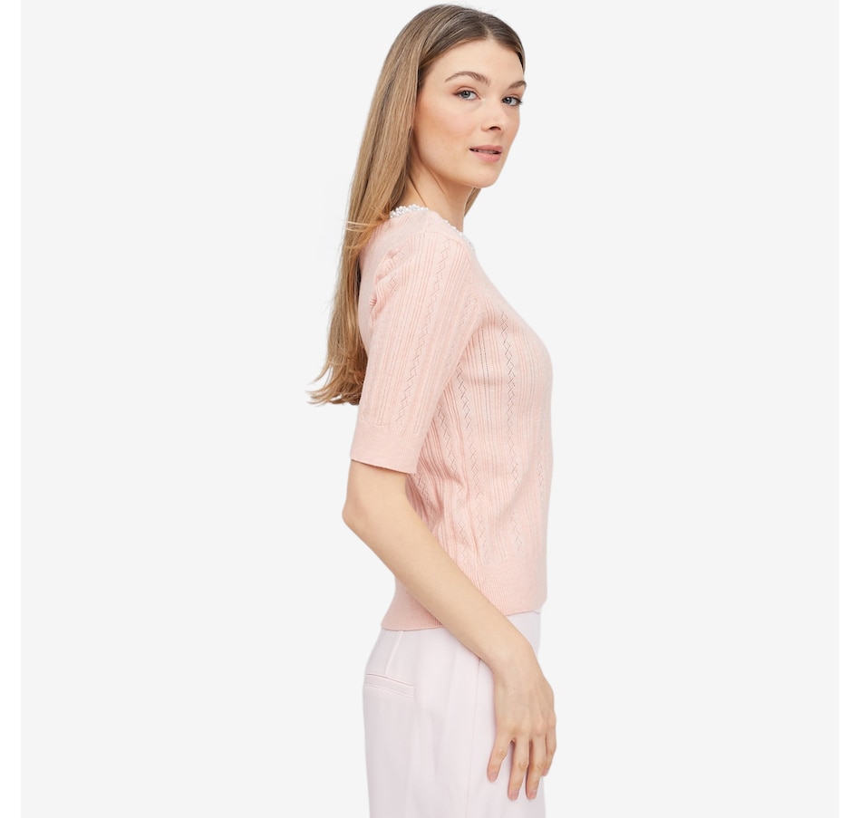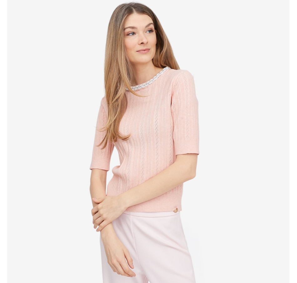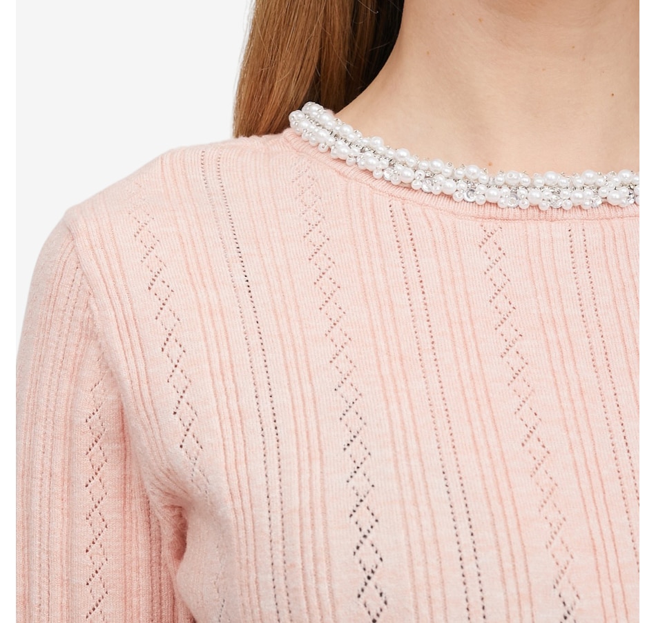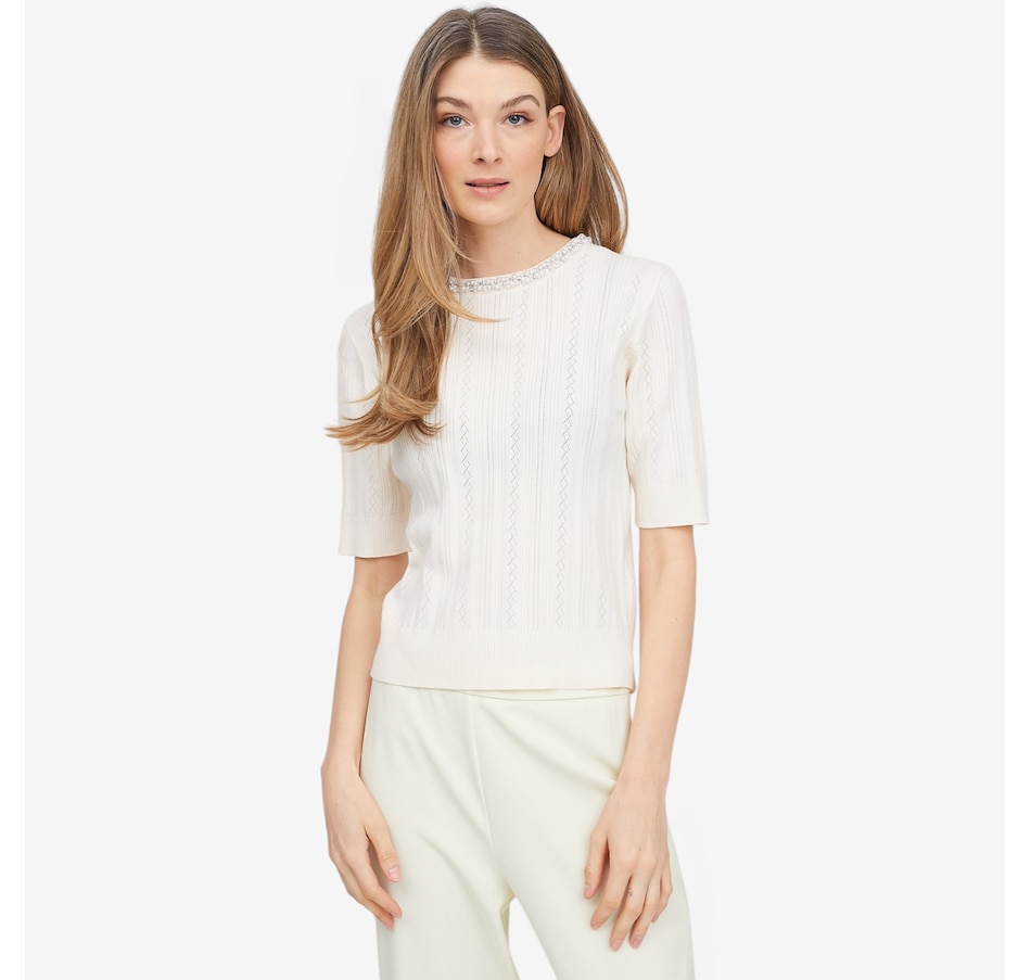 Add a touch of refined sparkle to your everyday style with ELLE’s embellished neck sweater. Crafted from a smooth, lightweight fine‑gauge knit, it offers an effortlessly comfortable feel whether layered or worn on its own. The delicately beaded crew neckline brings subtle sophistication, elevating the sweater with just the right amount of shimmer. Mid‑length elbow sleeves provide polished coverage perfect for transitional weather, while ribbed trim at the cuffs and hem ensures a refined finish that holds its shape beautifully. A feminine keyhole back with a small button closure adds both ease and charm, and the pull-on design keeps getting ready simple.