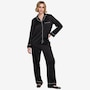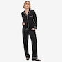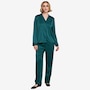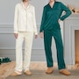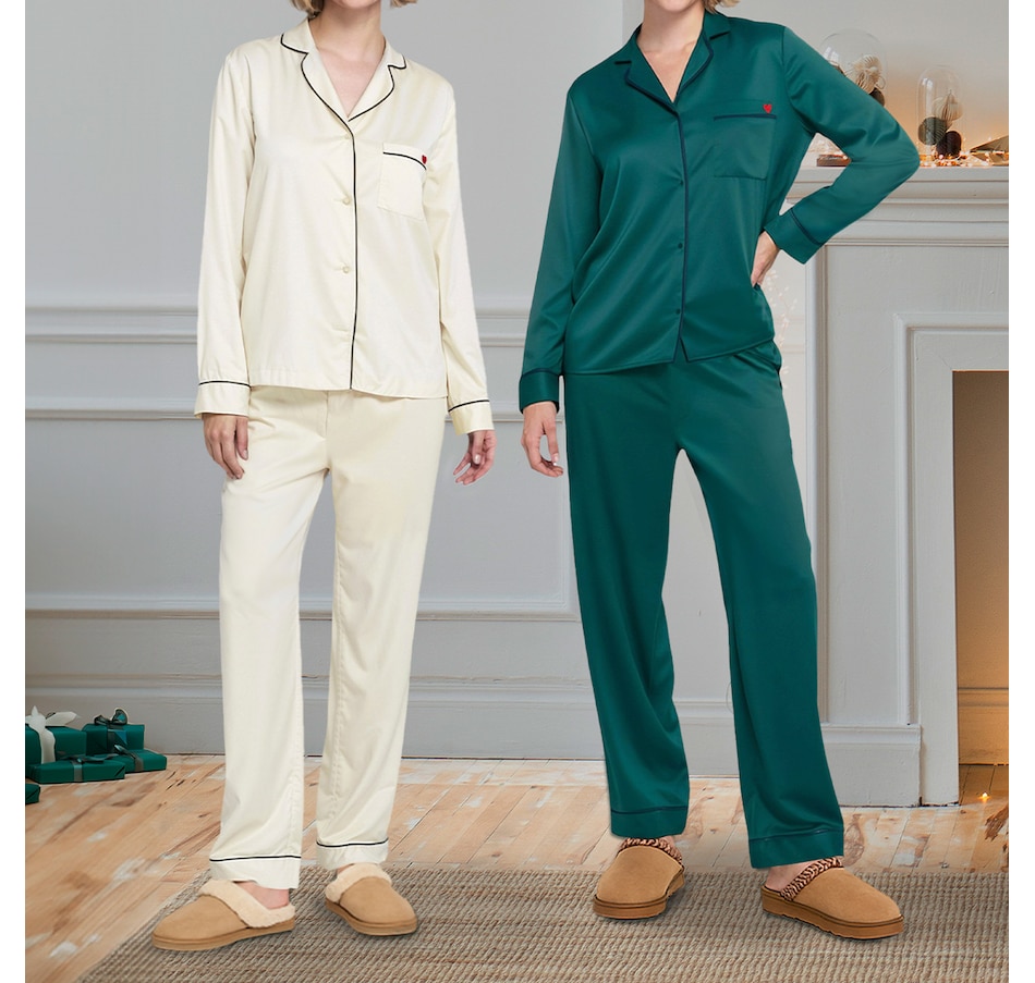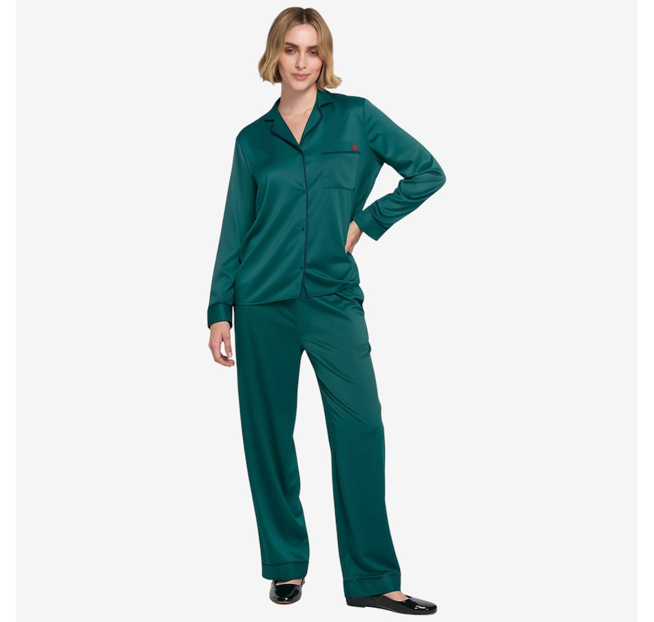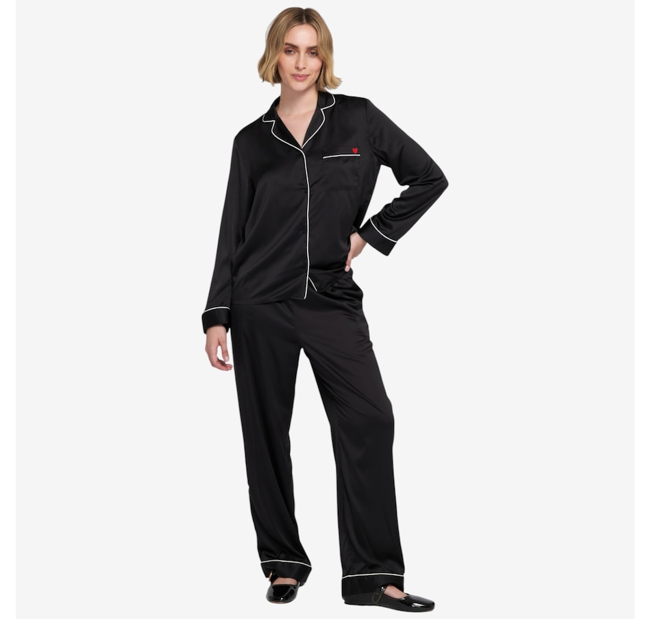 The luxe satin finish of this PJ set from ELLE delivers a smooth, silky touch against the skin. The pajama top features a notched collar and button front for classic appeal, and the chest pocket is embroidered with a subtle heart detail that adds a playful charm. The matching pant includes an elastic waistband and a relaxed fit for ease. There's contrast piping on the collar, cuffs, and hem which adds a tailored polish. This lightweight and breathable set is perfect for sleep or cozy evenings in.