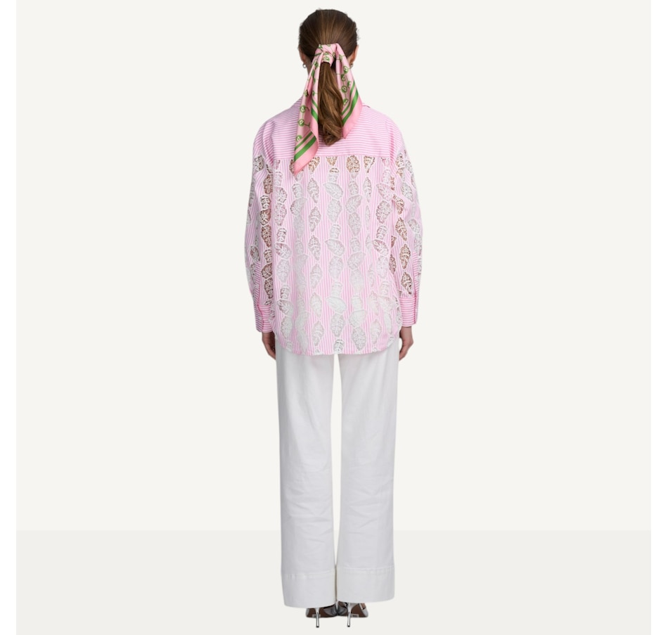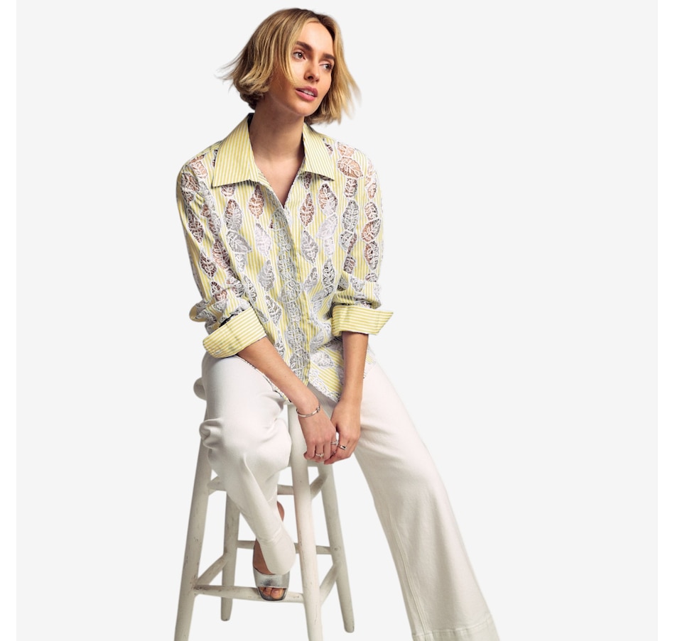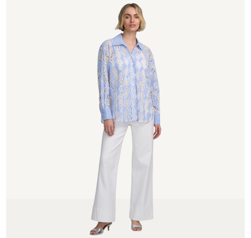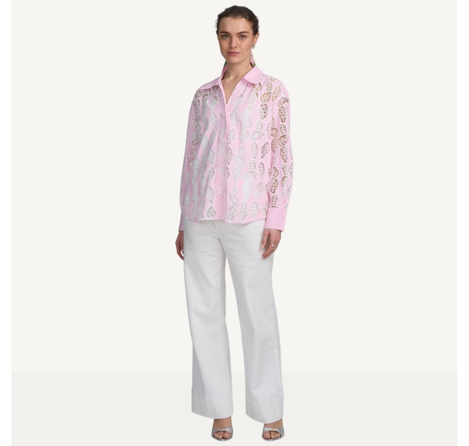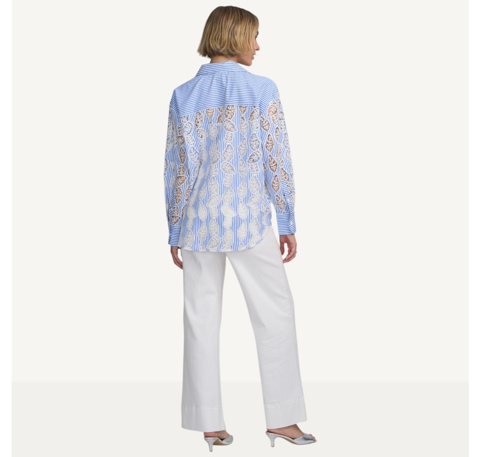 Elevate your everyday style with ELLE’s striped shirt, where delicate lace meets crisp tailoring for a beautifully balanced look. Sheer lace motifs overlay clean vertical stripes, creating a sophisticated mix of texture and structure that feels both feminine and polished. The included matching cami makes styling simple, giving you effortless coverage without compromising the airy, lightweight feel of the shirt. Classic button‑front details, including a pointed collar, full placket, and cuffed sleeves, ground the design in timeless shirting style while allowing the lace to truly shine.