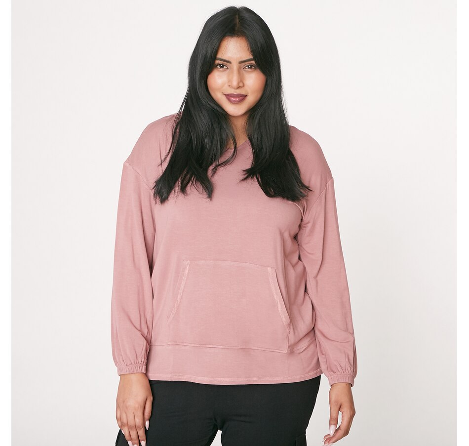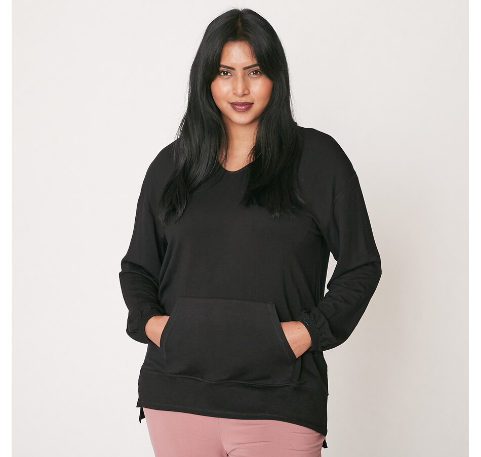 • Relaxed fit, elastic waistband with drawstring, high/low hem with side slits, hooded, long balloon sleeves, kangaroo pocket top
