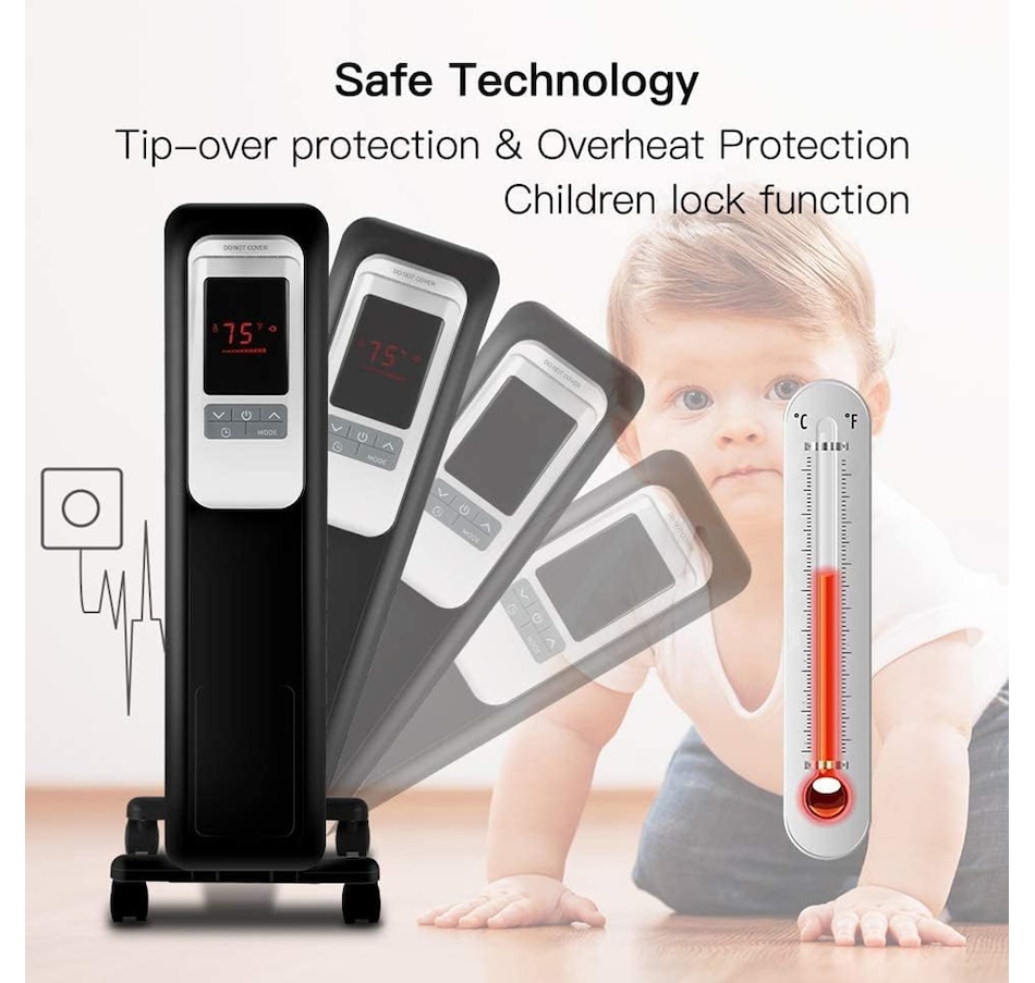 The Ecohouzng Digital Oil Filled Heater is ideal for small to medium rooms. This convenient, economical space heater has three adjustable heat settings, safety protection and an adjustable thermostat, as well as a built-in electronic tip-over switch system that turns the appliance off should it fall over accidentally; the heater will resume working with previous setting once back in its original position.