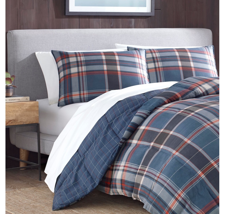 Make your bedroom a perfect escape from the stresses of modern life with this ultra-soft and incredibly comfortable micro-suede comforter set from Eddie Bauer. The microfibre fabric is brushed to create an exceptionally soft, plush feel, and the hypoallergenic down alternative fill ensures a lightweight loft that retains its shape, offering luxurious year-round comfort. A pair of classic plaids in a rich palette of indigo and navy blue with barn-red-and-white accents combine to create this handsome tailored ensemble with timeless appeal.