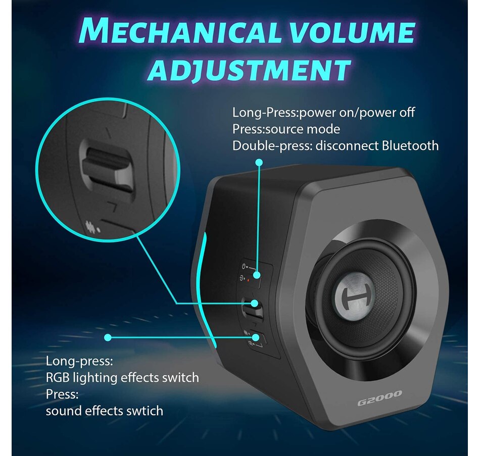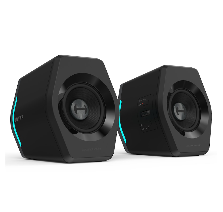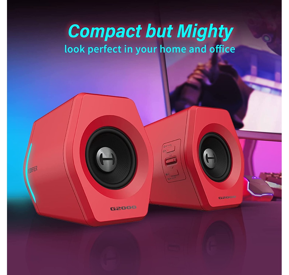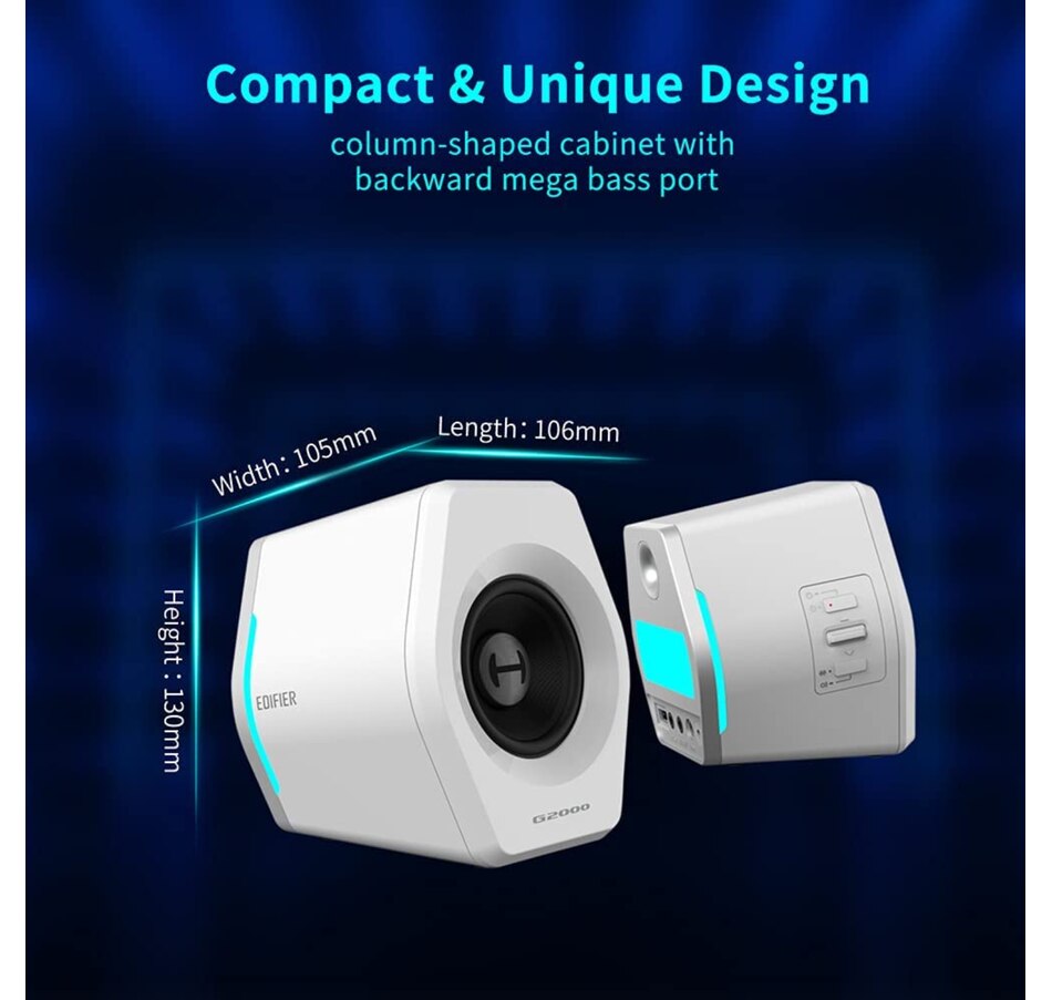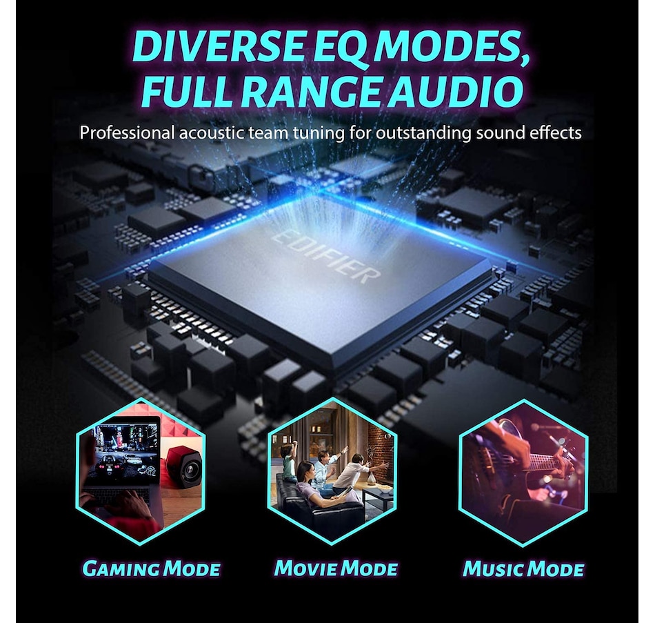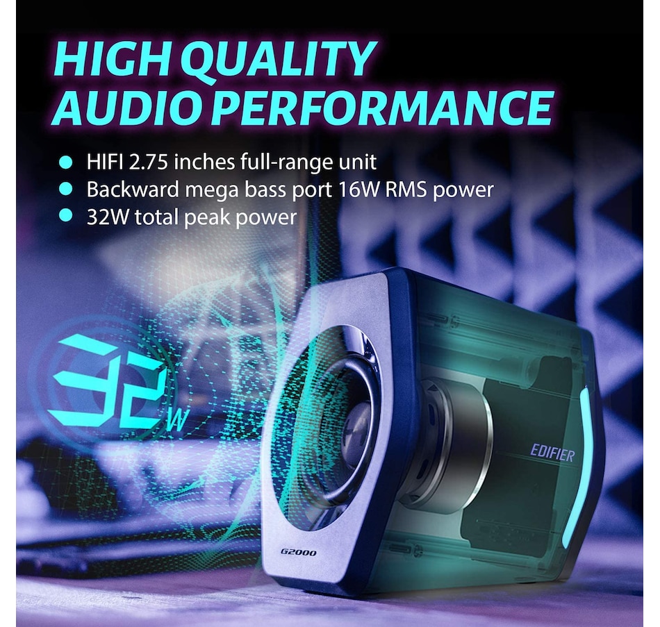 The Edifier Hecate G2000 Gaming Computer Speakers boast a total peak power of 32W, ensuring a remarkable audio experience. Customize your sound with EQ adjustments available in Game, Music, and Movie modes. Elevate your gaming immersion further with 12 mesmerizing RGB lighting effects.