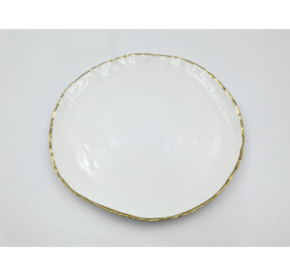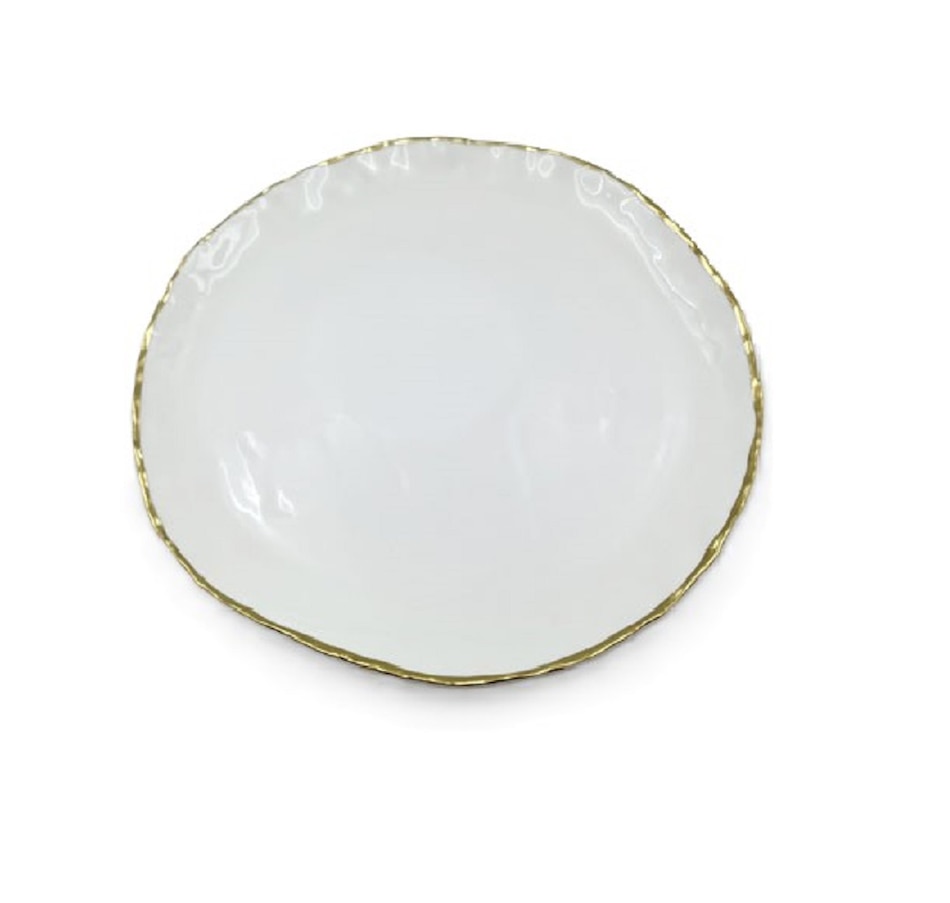 Elevate your dining experience with the Simplicity Collection's White Porcelain Gold Trim Freestyle Round Dinner Plate. This elegant yet functional tray combines sleek, modern design with timeless charm, making it a perfect centerpiece for everyday dining, special gatherings, or parties. Crafted from high-quality Porcelain, it features a smooth white finish accented by luxurious gold trim, creating a sophisticated look that complements any table setting. The design provides ample space for serving appetizers, desserts, or side dishes, while its durable construction ensures long-lasting use. Whether hosting a family gathering or entertaining guests, this serving tray adds a touch of elegance and refinement to every occasion. Add this beautiful serving tray to your collection and make every meal a special memorable moment!.Elegant Design: Crisp white Porcelain with a luxurious gold trim for a modern, stylish touch.Versatile Use: Perfect for everyday meals, parties, family gatherings, or formal dining.Durable Material: Made from high-quality Porcelain for long-lasting use.Easy to Clean: Smooth, non-porous surface makes cleaning quick and simple.