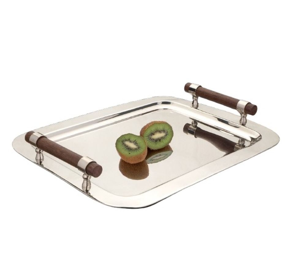 This 15.75 x 22" Stainless Steel Tray with Wood Handle combines sleek, modern design with practical functionality. Made from durable, high-quality stainless steel, the tray offers a smooth, easy-to-clean surface perfect for serving food or displaying items. Its spacious design provides ample room for various items, from appetizers to beverages. The wooden handles on either side ensure a comfortable, secure grip, adding a natural, warm contrast to the cool, polished stainless steel. Ideal for both casual and formal settings, this tray brings a touch of sophistication to any occasion while offering durability and ease of use. .Made from durable, high-quality stainless steel, the tray offers a smooth, easy-to-clean surface perfect for serving food or displaying items.Its spacious design provides ample room for various items, from appetizers to beverages. .The wooden handles on either side ensure a comfortable, secure grip, adding a natural, warm contrast to the cool, polished stainless steel. .