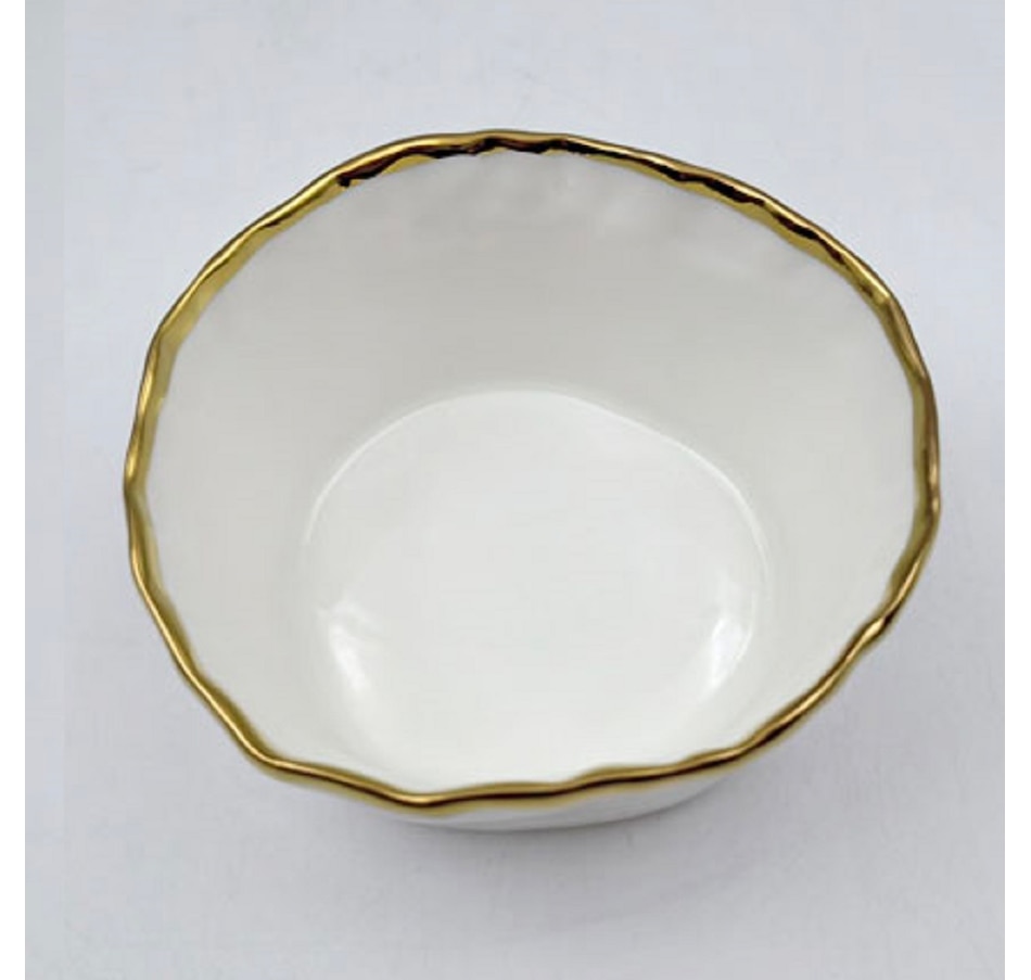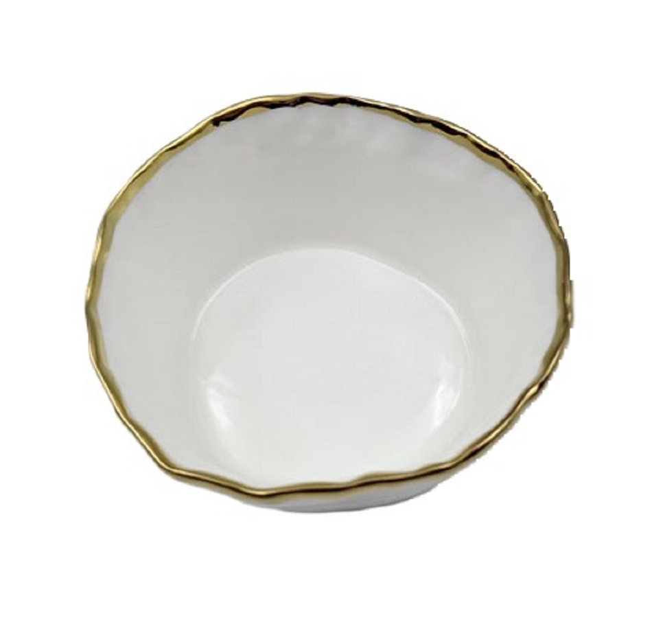 Elevate your dining experience with the Simplicity Collection's White Porcelain Gold Trim Freestyle Round Snack Bowl. This elegant yet functional tray combines sleek, modern design with timeless charm, making it a perfect centerpiece for everyday dining, special gatherings, or parties. Crafted from high-quality Porcelain, it features a smooth white finish accented by luxurious gold trim, creating a sophisticated look that complements any table setting.