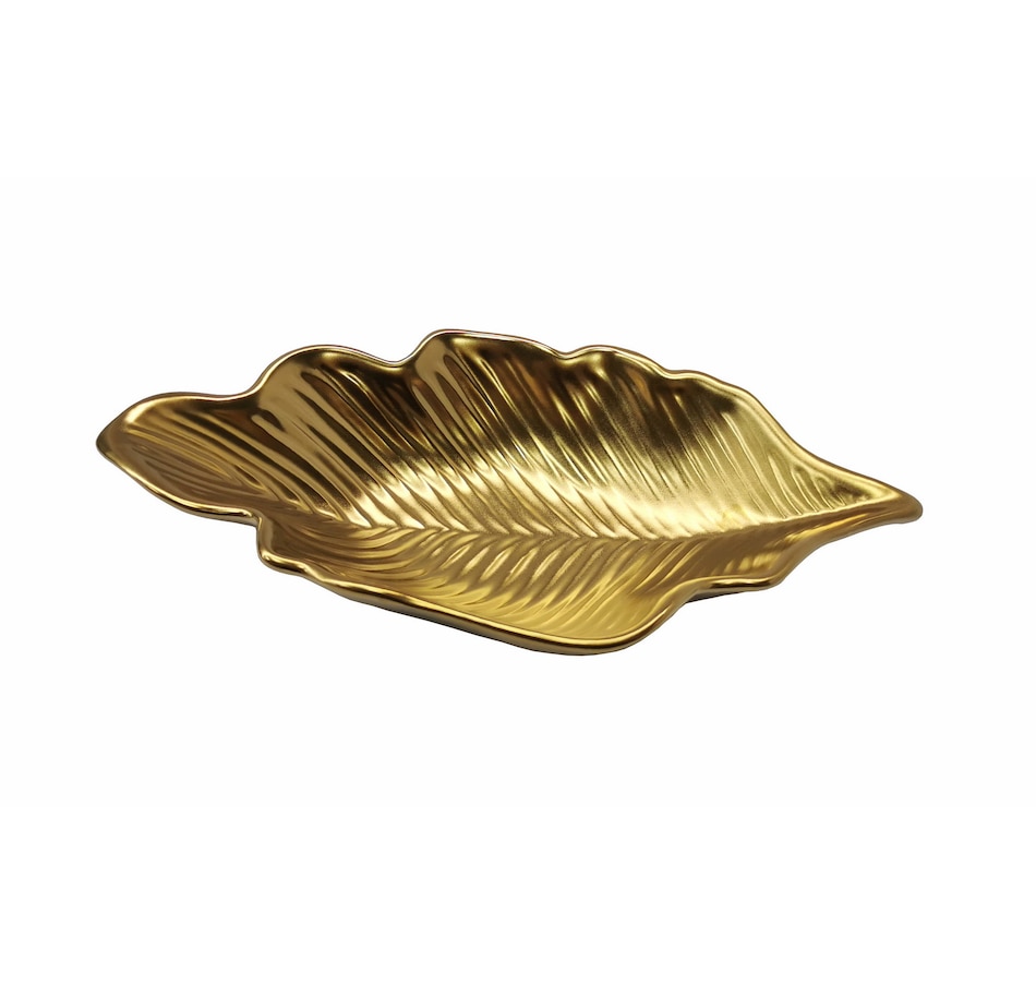 Botanic leaf inspired serving plate in porcelain. The natural edges and details make this the perfect platter and server. Perfect for Hors D'Oeuvres and dessert. The organic edges blend in with a variety of table motifs. Food safe, stain resistant, dishwasher safe. Combines the wonderful features of metal and leaf with the elegance of porcelain.Free-form leaf inspired serving plate in porcelain. The free-form leaf details make this the perfect platter for cheese and crackers or any food delicacy.Leaf inspired server perfect for Hors D 'Oeuvres and entertaining. The organic leaf details blend in with a variety of table motifs.Elegant Gold Finished Titanium high-fired porcelain.Combines the wonderful features of metal and wood with the practicality of porcelain.