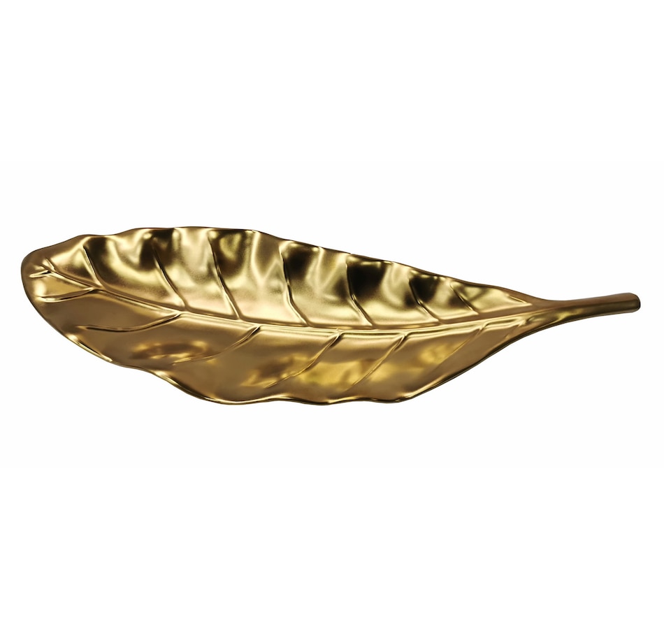 Botanic leaf inspired serving plate in porcelain. The natural edges and details make this the perfect platter and server. Perfect for Hors D'Oeuvres and dessert. The organic edges blend in with a variety of table motifs. Food safe, stain resistant, dishwasher safe. Combines the wonderful features of metal and leaf with the elegance of porcelain.Free-form leaf inspired serving plate in porcelain. The free-form leaf details make this the perfect platter for cheese and crackers or any food delicacy.Leaf inspired server perfect for Hors D 'Oeuvres and entertaining. The organic leaf details blend in with a variety of table motifs.Elegant Gold Finished Titanium high-fired porcelain.Combines the wonderful features of metal and wood with the practicality of porcelain.