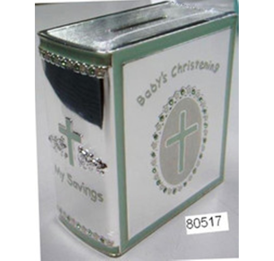 Christening bank, silver plated and enameled. Here is a beautiful and unique money bank for baby's christening. It is designed in the shape of a bible, featuring a cross on front. Special wording with "My Savings".