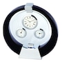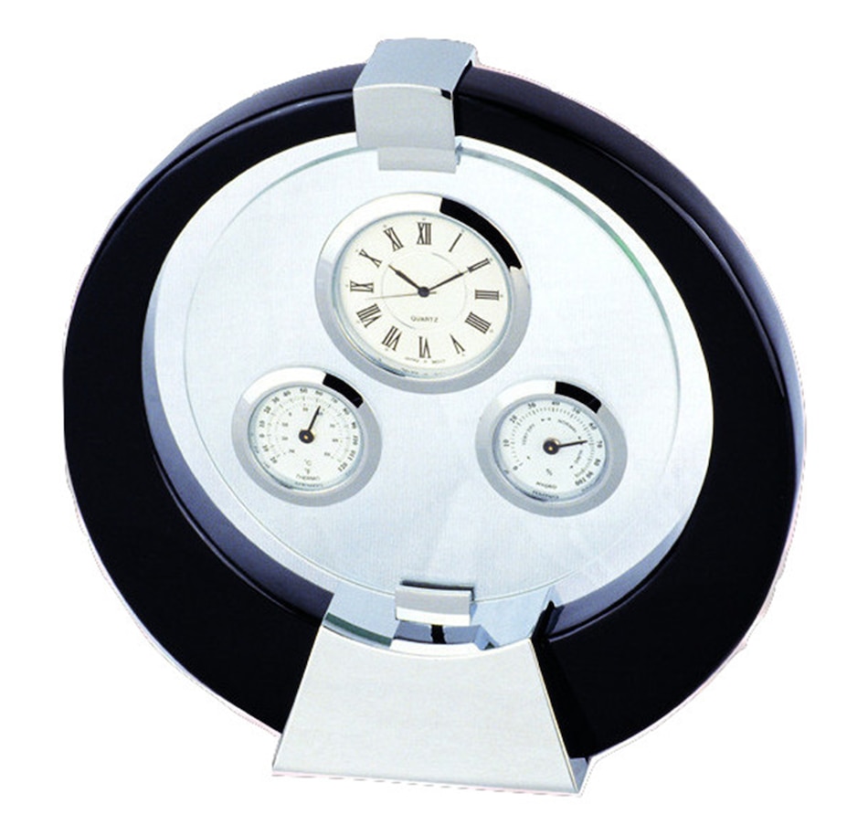 The Time and Weather station desk set is made with black piano wood and silver mantle clock also includes a barometer and hygrometer.