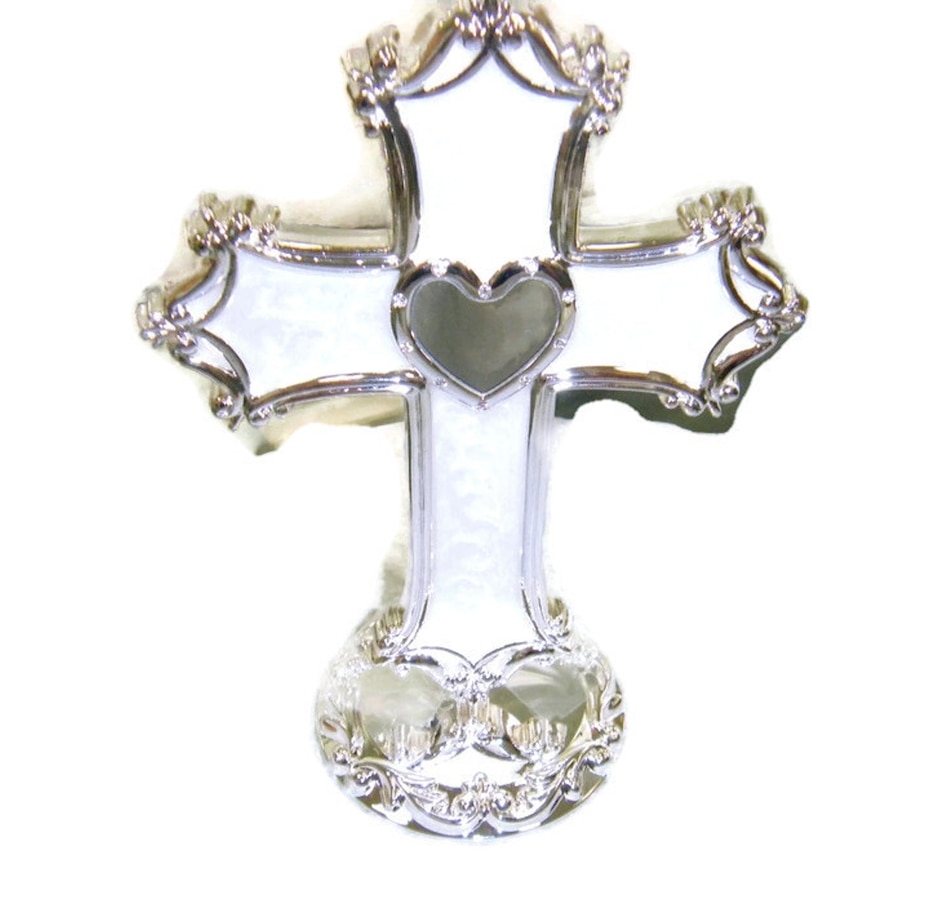 Silver plated, Enameled & Jeweled Crucifix. These stunning Enamel Crucifix's are handcrafted. Remaining classic in form, this cross is ready to lay flat on desk or tabletop. The silver heart at center really stand out against the vivid enamel inset of the cross. A popular gift choice that serves as a reminder to take up our cross daily and follow Christ the King.
