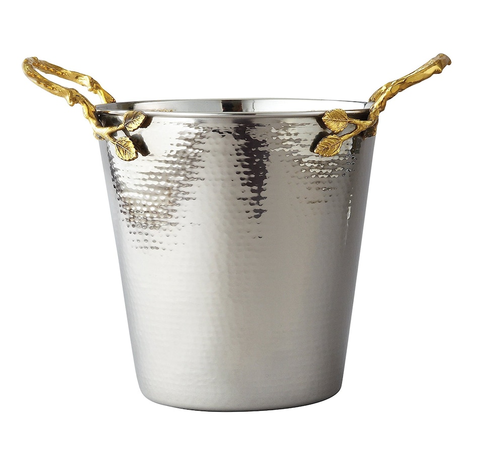 This elegant stainless steel bucket is accented by a whimsical Golden Vine. Perfect for ice, wine, champagne, or just use as a beautiful home decor piece. Features - Hammered stainless steel - 8 inch diameter - Hand wash and dry - Gold trim accent - Decorative and functional. Upgrade your title to host of the year with quality serve ware, dishware, table decor, and more! Elegance is perfectly ideal for any home kitchen, commercial kitchen, or occasion. Bring hotel luxury home.Material: Stainless Steel.Care Instruction: Hand Wash.Color: Elegance Silver, Gold.A beautiful home decor piece