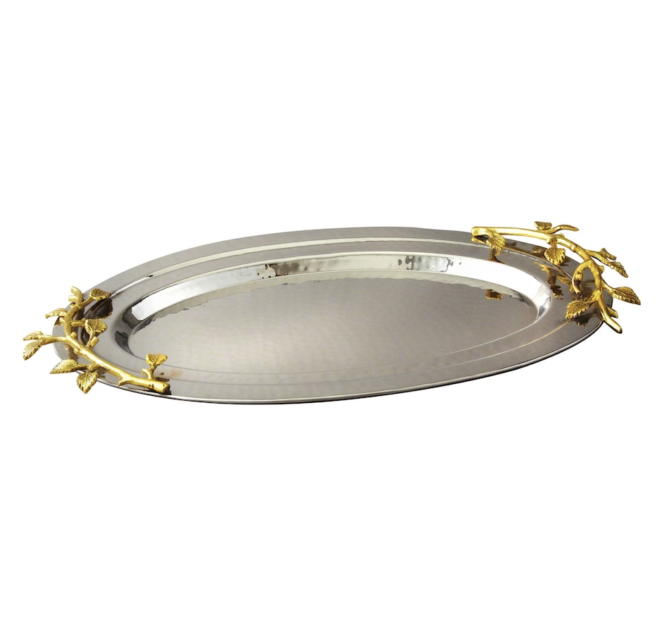 Elegance Gilt Leaf Oval Hammered Stainless Steel Tray 16-1/2" x 1" Elegance is the missing ingredient to any great dinner party. Upgrade your title to host of the year with quality serve ware, dishware, table decor, and more! Elegance is perfectly ideal for any home kitchen, commercial kitchen, or occasion. Bring hotel luxury home.This 16-1/2" x 1" Oval Gilt Leaf Hammered Stainless Steel Tray creates a dramatic yet sophisticated backdrop for bold, audacious food design.This 16-1/2" x 1" Oval Gilt Leaf Hammered Stainless Steel Tray creates a dramatic yet sophisticated backdrop for bold, audacious food design.Whether you are serving a regal feast or an understated range of entrees, this tray will finish the look off with a mirror-finish border.A beautiful home decor piece